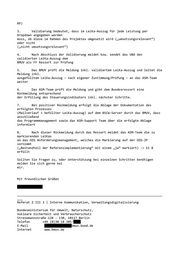 RP) 3. Validierung bedeutet, dass im LeiKa-Auszug für jede Leistung per Dropdown angegeben werden muss, ob diese im Rahmen des Projektes umgesetzt wird („umsetzungsrelevant“) oder nicht („nicht umsetzungsrelevant“) 4. Nach Abschluss der Validierung meldet bzw. sendet das UBA den validierten LeiKa-Auszug dem BMUV als FF Ressort zur Prüfung 5. Das BMUV prüft die Meldung inkl. validiertem LeiKa-Auszug und leitet die Meldung inkl. ausgefülltem LeiKa-Auszug – nach eigener Zustimmung/Prüfung – an das ASM-Team weiter 6. Das ASM-Team prüft die Meldung und gibt dem Bundesressort eine Rückmeldung entsprechend der Erfüllung des Steuerungsindikators inkl. nächster Schritte. 7. Bei positiver Rückmeldung erfolgt die Ablage der Dokumentation des erfolgten Prozesses (Mailverlauf + befüllter LeiKa-Auszug) auf dem BSCW-Server durch das BMUV, dass anschließend das Programmmanagement sowie das ASM-Support Team über die erfolgte Ablage informiert 8. Nach dieser Rückmeldung durch das Ressort meldet das ASM-Team die zu markierenden LeiKas an das OZG Anforderungsmanagement, welches die Markierung auf der OZG-IP vornimmt („Bestandteil der Referenzimplementierung“ mit einem „ja“ markiert) -> SI 8 erfüllt Sollten Sie Fragen zu, oder Unterstützung bei einzelnen Schritten benötigen melden Sie sich gerne bei mir. Mit freundlichen Grüßen ________________________________________________________________________________ ___ Referat Z III 3 | Interne Kommunikation, Verwaltungsdigitalisierung Bundesministerium für Umwelt, Naturschutz, nukleare Sicherheit und Verbraucherschutz Stresemannstraße 128 - 130, 10117 Berlin Telefon +49 (0)30 18 305- E-Mail bmuv.bund.de Internet www.bmuv.de