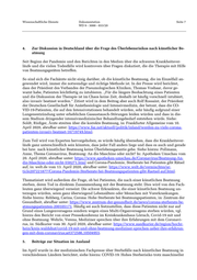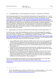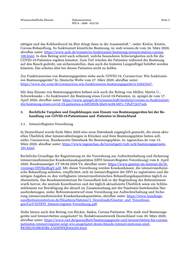 Wissenschaftliche Dienste Dokumentation Seite 6 WD 9 - 3000 - 033/20 3.2. S 1-Empfehlungen zur intensivmedizinischen Therapie von Patienten mit COVID-19 Die Arbeitsgemeinschaft der Wissenschaftlichen Medizinischen Fachgesellschaften e. V. hat im 1 März 2020 S 1 Empfehlungen zur intensivmedizinischen Therapie von Patienten, die an COVID- 19 erkrankt sind, veröffentlicht, abrufbar unter: https://www.awmf.org/uploads/tx_szleitli- nien/113-001l_S1_Intensivmedizinische-Therpie-von-Patienten-mit-Covid-19_2020-03.pdf. Zu den Fachgesellschaften gehören u. a. die Deutsche Gesellschaft für Internistische Intensivmedizin und Notfallmedizin und die Deutsche Gesellschaft für Pneumologie und Beatmungsmedizin (DGP). Im Abschnitt „Maßnahmen bei akuter hypoxämischer respiratorischer Insuffizienz“ wer- den Empfehlungen dazu ausgesprochen, welche Therapien in den konkreten Krankheitsstadien angewandt werden sollen und welche besonderen Vorsichtsmaßnahmen die Ärzte bei der Be- handlung im Blick haben müssen. 3.3. Empfehlungen der Deutschen Gesellschaft für Pneumologie und Beatmungsmedizin e. V. Die DGP hat am 22. April 2020 Empfehlungen zum Einsatz von Beatmungsgeräten ausgespro- chen, siehe: Pfeifer, M./Ewig, S., u. a., Positionspapier zur praktischen Umsetzung der Differenti- altherapie der akuten respiratorischen Insuffizienz bei COVID-19, abrufbar unter: https://pneumologie.de/fileadmin/user_upload/COVID-19/20200417_DGP__app._Differenzialthe- rapie_ARI_COVID-19.pdf. Die Autoren befassen sich mit verschiedenen Themenkomplexen (Stel- lungnahmen 1 bis 5) und treffen wesentliche Kernaussagen, wie etwa: „Sauerstofftherapie inklusive High-Flow (NHF) und die nicht-invasive Beatmung/CPAP- Therapie unter Verwendung einer Mund-Nasen-Maske oder eines Beatmungshelms kön- nen als Therapieeskalation bei nicht ausreichender normaler Sauerstofftherapie durchge- führt werden, solange die Kriterien für eine endotracheale Intubation nicht erfüllt sind.“ (Kernaussage 4.1) „Die nicht-invasive Beatmung bei akuter hypoxämischer Insuffizienz bei Patienten mit COVID-19 sollte auf der Intensivstation oder in einer vergleichbaren Struktur mit entspre- chender personeller Expertise erfolgen.“ (Kernaussage 5.1) „Bei Patienten mit COVID-19 und respiratorischer Insuffizienz, bei denen eine invasive Beatmung unter Ausschöpfung der o. g. Maßnahmen nicht ausreicht, um eine ausrei- chende Sauerstoffaufnahme und CO2-Abgabe zu gewährleisten, soll ein extrakorporales Lungenersatzverfahren erwogen werden. Voraussetzungen sind dafür die medizinische Indikation und der Patientenwille.“ (Kernaussage 5.3) Über die neuen Empfehlungen berichtete auch der Bayerische Rundfunk am 20. April 2020, Coronavirus: Wie steht es um die Beatmung als Therapie?, brufbar unter: https://www.br.de/nachrichten/wissen/coronavirus-wie-steht-es-um-die-beatmung-als-thera- pie,RwhbHns. 1 Hinweis: Die Empfehlungen und Leitlinien der AMWF werden – je nach Entwicklungsstufe – als S1, S2e, S2k oder S3 – Leitlinie bzw. Empfehlung klassifiziert, vgl. die Übersicht bei AWMF, abrufbar unter: https://www.awmf.org/leitlinien/awmf-regelwerk/ll-register.html.