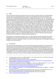 Wissenschaftliche Dienste Ausarbeitung Seite 9 WD 3 – 3000 – 057/12 4.3. Berlin Nach Auskunft der Senatsverwaltung für Inneres und Sport in Berlin gelten für die Verbeamtung von Personen mit Schwerbehinderung in erster Linie die allgemeinen beamtenrechtlichen Vor- 18 schriften des Landesbeamtengesetzes für Berlin . Ergänzend dazu gibt es vom 31. August 2006 Verwaltungsvorschriften über die gleichberechtigte Teilhabe der behinderten oder von Behinderung 19 bedrohten Menschen in der Berliner Verwaltung . Darin wird die sozialpolitische Rolle der Arbeit- geber u. a. bei der Einstellung erläutert. Die Einstellung und Beschäftigung schwerbehinderter Men- schen darf nicht an baulichen oder technischen Hindernissen scheitern. Es wird auf die gesetzlich vorgeschriebene Beschäftigtenquote nach § 71 Abs. 1 SGB IX schwerbehinderte Menschen hinge- wiesen. In Stellenausschreibungen muss darauf hingewiesen werden, dass schwerbehinderte Men- schen bei gleicher Eignung bevorzugt eingestellt werden. Außerdem sind die individuell abgefass- ten Integrationsvereinbarungen bei den Verfahrensabläufe für Einstellungen zu beachten. Gemäß 20 § 18 Abs. 1 des Laufbahngesetzes (LfbG) kann bei der Einstellung von schwerbehinderten Men- schen in das Beamtenverhältnis nur das für die Laufbahn erforderliche Mindestmaß an körperlicher Eignung verlangt werden. Die körperliche Eignung wird im Allgemeinen auch dann noch als aus- reichend angesehen, wenn der schwerbehinderte Mensch nur für die Wahrnehmung bestimmter Dienstposten der betreffenden Laufbahn körperlich geeignet ist. Die genannten Verwaltungsvorschriften vom 31. August 2006 sind am 30. September 2011 außer Kraft getreten und werden derzeit überarbeitet. Bis zum Neuerlass der Verwaltungsvorschriften empfiehlt die Senatsverwaltung für Inneres und Sport die bisher geltenden Verwaltungsvorschriften 21 zunächst weiter anzuwenden . 4.4. Brandenburg Nach Auskunft des Ministeriums des Innern des Landes Brandenburg gelten für die Verbeamtung von Personen mit Schwerbehinderung in erster Linie die allgemeinen beamtenrechtlichen Vor- 22 schriften des Beamtengesetzes für das Land Brandenburg . Ferner sind die Richtlinien für die Ein- stellung, Beschäftigung und begleitende Hilfe schwerbehinderter und diesen gleichgestellter behin- derter Menschen in der Landesverwaltung des Landes Brandenburg (Schwerbehindertenrichtlinien 23 - SchwbRL) vom 11. Mai 2005 zu beachten. Danach darf bei der Einstellung von schwerbehinder- ten Menschen als Beamte sowie bei ihrer Anstellung und Beförderung nur das Mindestmaß an kör- 18 Landesbeamtengesetz (LBG) vom 19. März 2009 (GVBl. S. 70), zuletzt geändert durch Art. III Berliner Besoldungs- neuregelungsgesetz vom 29. 6. 2011 (GVBl. S. 306); http://gesetze.berlin.de/default.aspx?typ=reference&y=100&g=BlnLBG 19 http://www.berlin.de/imperia/md/content/hvp/gesetzeundurteile/vv_integration_beh._menschen.pdf?start&ts= 1184849181&file=vv_integration_beh._menschen.pdf 20 Gesetz über die Laufbahnen der Beamten (Laufbahngesetz – LfbG) vom 16. Februar 2003 (GVBl. S. 137, ber. S. 200), zuletzt geändert durch Art. VI Abs. 3 Satz 2 2. DRÄndG vom 21. Juni 2011 (GVBl. S. 266); http://gesetze.berlin.de/?vpath=bibdata%2Fges%2FBlnLfbG%2Fcont%2FBlnLfbG.htm 21 http://www.berlin.de/imperia/md/content/hvp/rundschreiben2011/rs09- 2011/vv_integration___seninnsport_rs_i_nr._102_2011.pdf?start&ts=1315484054&file=vv_integration___seninnspor t_rs_i_nr._102_2011.pdf 22 Beamtengesetz für das Land Brandenburg (Landesbeamtengesetz – LBG) vom 3. April 2009 (GVBl.I/09, [Nr. 04], S.26), zuletzt geändert durch Artikel 1 des Gesetzes vom 11. März 2010 (GVBl.I/10, [Nr. 13]); http://www.bravors.brandenburg.de/sixcms/detail.php?gsid=land_bb_bravors_01.c.47970.de 23 http://www.brandenburg.de/media/2162/87_7.pdf