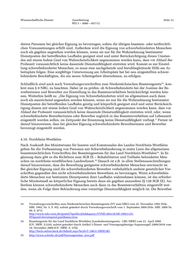 Wissenschaftliche Dienste Ausarbeitung Seite 12 WD 3 – 3000 – 057/12 derten Personen bei gleicher Eignung zu bevorzugen, sofern die übrigen beamten- oder tarifrechtli- chen Voraussetzungen erfüllt sind. Außerdem wird die Eignung von schwerbehinderten Menschen noch als gegeben angesehen werden können, wenn sie nur für die Wahrnehmung bestimmter Dienstposten der betreffenden Laufbahn geeignet sind und unter Berücksichtigung dieses Umstan- des mit einem hohen Grad von Wahrscheinlichkeit angenommen werden kann, dass vor Ablauf der Probezeit voraussichtlich keine dauernde Dienstunfähigkeit eintreten wird. Kommt es zur Einstel- lung schwerbehinderter Menschen, so muss eine nachgehende und berufsbegleitende Hilfe am Ar- beitsplatz folgen. Eine sorgfältige Unterweisung am Arbeitsplatz hat bei neu eingestellten schwer- behinderte Beschäftigten, die ein neues Arbeitsgebiet übernehmen, zu erfolgen. 33 Schließlich sind auch noch Verwaltungsvorschriften zum Niedersächsischen Beamtengesetz , kon- kret zum § 8 NBG, zu beachten. Dabei ist zu prüfen, ob Schwerbehinderte bei der Auslese der Be- werberinnen und Bewerber zur Einstellung in das Beamtenverhältnis berücksichtigt werden kön- nen. Weiterhin heißt es: „Die Eignung von Schwerbehinderten wird im allgemeinen auch dann noch als ausreichend angesehen werden können, wenn sie nur für die Wahrnehmung bestimmter Dienstposten der betreffenden Laufbahn geistig und körperlich geeignet sind und unter Berücksich- tigung dessen mit einem hohen Grad von Wahrscheinlichkeit angenommen werden kann, dass vor Ablauf der Probezeit voraussichtlich keine dauernde Dienstunfähigkeit eintreten wird, oder, wenn schwerbehinderte Bewerberinnen oder Bewerber sogleich in das Beamtenverhältnis auf Lebenszeit eingestellt werden sollen, im Zeitpunkt der Ernennung keine Dienstunfähigkeit vorliegt.“ Ferner ist darauf hinzuweisen, dass bei gleicher Eignung schwerbehinderte Bewerberinnen und Bewerber bevorzugt eingestellt werden. 4.10. Nordrhein-Westfalen Nach Auskunft des Ministeriums für Inneres und Kommunales des Landes Nordrhein-Westfalen gelten für die Verbeamtung von Personen mit Schwerbehinderung in erster Linie die allgemeinen 34 beamtenrechtlichen Vorschriften des Beamtengesetzes für das Land Nordrhein-Westfalen . In Er- gänzung dazu gibt es die Richtlinie zum SGB IX – Rehabilitation und Teilhabe behinderter Men- 35 schen im nordrhein-westfälischen Landesdienst. Danach ist z.B. in allen Stellenausschreibungen darauf hinzuweisen, dass die Bewerbung geeigneter schwerbehinderter Menschen erwünscht ist. Bei gleicher Eignung sind die schwerbehinderten Bewerber vorbehaltlich anderer gesetzlicher Vor- schriften gegenüber den nicht schwerbehinderten Bewerbern zu bevorzugen. Wenn schwerbehin- derte Menschen nur bestimmte Dienstposten ihrer Laufbahn wahrnehmen können, ist das erforder- liche Mindestmaß an körperlicher Eignung bereits dann als gegeben anzusehen (§ 128 SGB IX). Au- ßerdem können schwerbehinderte Menschen auch dann in das Beamtenverhältnis eingestellt wer- den, wenn als Folge ihrer Behinderung eine vorzeitige Dienstunfähigkeit möglich ist. Die Bewerber 33 Verwaltungsvorschriften zum Niedersächsischen Beamtengesetz (VV zum NBG) vom 25. November 1992 (Nds. MBl. 1993, Nr. 5, S. 93), zuletzt geändert durch Verwaltungsvorschrift vom 1. September 2009 (Nds. MBl. 2009 Nr. 40, S. 871) http://www.nds-voris.de/jportal/?quelle=jlink&query=VVND-204110-MI-19921125- SF&psml=bsvorisprod.psml&max=true 34 Beamtengesetz für das Land Nordrhein-Westfalen (Landesbeamtengesetz - LBG NRW) vom 21. April 2009 (GV. NRW. S.224), zuletzt geändert durch Artikel 3 Dienst- und Versorgungsbezüge-AnpassungsG 2009/2010 vom 10. November 2009 (GV. NRW. S. 570); http://beck-online.beck.de/default.aspx?bcid=Y-100-G-NRWLBG 35 http://www.schwbv.de/pdf/fuersorgeerlass_nrw.pdf