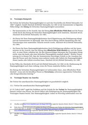 Wissenschaftliche Dienste Sachstand Seite 14 WD 3 - 3000 - 290/19 12. Vereinigtes Königreich Der Verlust der britischen Staatsangehörigkeit ist nach den Vorschriften des British Nationality Act 25 1981 möglich. Gemäß Abschnitt 40 British Nationality Act 1981 ist der Innenminister in folgenden Fällen befugt, den Entzug der britischen Staatsangehörigkeit anzuordnen: – Der Innenminister ist der Ansicht, dass der Entzug dem öffentlichen Wohl dient und die Person würde durch den Entzug der britischen Staatsangehörigkeit nicht staatenlos, Abschnitt 40 (2), Abschnitt 40 (4) British Nationality Act 1981; – die Person hat ihren Staatsangehörigkeitsstatus durch Registrierung oder Einbürgerung erlangt und der Innenminister ist überzeugt, dass dies durch Betrug, falsche Darstellung oder das Verschweigen einer materiellen Tatsache erreicht wurde, Abschnitt 40 (3) British Nationality Act 1981; – die Person hat ihren Staatsangehörigkeitsstatus durch Einbürgerung erhalten und der Innen- minister ist der Ansicht, dass der Entzug dem öffentlichen Wohl dienlich ist, weil die Person sich „in einer Weise verhalten hat, die den lebenswichtigen Interessen des Vereinigten König- reichs, einer der Inseln oder eines britischen Überseegebiets ernsthaft schadet“. Weitere Voraus- setzung ist in diesem Fall, dass der Innenminister berechtigte Gründe zu der Annahme hat, dass die Person nach den Gesetzen eines anderen Landes oder Gebiets die Staatsangehörigkeit dieses Landes oder Gebiets erwerben kann, Abschnitt 40 (4A) British Nationality Act 1981. In den Fällen des Abschnitts 40 (3) und (4A) British Nationality Act 1981 ist die Aberkennung der Staatsangehörigkeit auch dann zulässig, wenn die Person staatenlos bleiben würde. Ein Entzug der britischen Staatsangehörigkeit ist insbesondere dann „dem öffentlichen Wohl dienlich“, wenn sich die betroffene Person an Terrorismus, schwerem organisierten Verbrechen 26 oder Kriegsverbrechen beteiligt. 13. Vereinigte Staaten von Amerika Der Verlust der amerikanischen Staatsangehörigkeit ist grundsätzlich möglich. 13.1. Verlust der amerikanischen Staatsangehörigkeit 27 8 U.S. Code § 1481 regelt das Verfahren und die Gründe für den Verlust der Staatsangehörigkeit. Danach verliert eine Person, die durch Geburt oder Einbürgerung die Staatsangehörigkeit der Vereinigten Staaten besitzt, ihre Staatsangehörigkeit, indem sie freiwillig insbesondere eine der 25 Abrufbar unter http://www.legislation.gov.uk/ukpga/1981/61 in englischer Sprache (letzter Abruf 27. Februar 2020). 26 Siehe dazu auch die Informationsbroschüre des House of Commons zum Verlust der britischen Staatsangehörigkeit vom 9. Juni 2017, 5, abrufbar unter: https://researchbriefings.parliament.uk/ResearchBriefing/Sum- mary/SN06820#fullreport in englischer Sprache (letzter Abruf 27. Februar 2020). 27 Abrufbar unter: https://www.law.cornell.edu/uscode/text/8/1481 in englischer Sprache (letzter Abruf 27. Februar 2020).