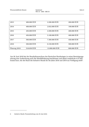 Wissenschaftliche Dienste Sachstand Seite 8 WD 10 - 3000 - 086/18 2013 406.000 EUR 2.208.000 EUR 260.000 EUR 2014 406.000 EUR 2.832.000 EUR 190.000 EUR 2015 456.000 EUR 4.500.000 EUR 400.000 EUR 2016 456.000 EUR 5.100.000 EUR 400.000 EUR 2017 506.000 EUR 7.300.000 EUR 450.000 EUR 2018 506.000 EUR 8.150.000 EUR 500.000 EUR Planung 2019 518.650 EUR 13.000.000 EUR 600.000 EUR Am 28. Juni 2018 hat der Haushaltsausschuss des Deutschen Bundestages in seiner Bereinigungs- sitzung eine Aufstockung auch der Musikförderung beschlossen und damit zusätzliche 4,15 Mil- lionen Euro, die der Bund der Initiative Musik für die Jahre 2018 und 2019 zur Verfügung stellt . 6 6 Initiative Musik, Pressemitteilung vom 29. Juni 2018.