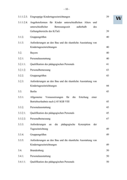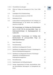 -9- 1.1.4.5.2. Wirtschaftliche Zuverlässigkeit 29 1.1.4.6. Pflicht zur Vorlage einer Konzeption (§ 45 Abs. 2 Satz 3 SGB VIII) 30 1.1.5. Zuständigkeit für die Erlaubniserteilung 30 1.2. Der Landesrechtsvorbehalt des § 49 SGB VIII 31 1.2.1. Bedeutung der Norm 31 1.2.2. Landesrechtliche Gestaltungsspielräume bei der Festlegung von Mindestanforderungen an den Betrieb einer Einrichtung im Sinne des § 45 SGB VIII 32 2. Die Voraussetzungen zur Erteilung einer Betriebserlaubnis nach § 45 SGB VIII für privat-gewerbliche Träger von Kindertageseinrichtungen als Regelungsgegenstand des Landesrechts 32 3. Landesrechtliche Voraussetzungen zur Erteilung einer Betriebserlaubnis für privat-gewerbliche Träger von Kindertageseinrichtungen 35 3.1. Baden-Württemberg 35 3.1.1. Personalausstattung 35 3.1.1.1. Qualifikation des pädagogischen Personals 35 3.1.1.1.1. Qualifikation des pädagogischen Personals in Einrichtungen im Sinne des Kindertagesbetreuungsgesetzes 35 3.1.1.1.2. Qualifikation des pädagogischen Personals in Einrichtungen außerhalb des Anwendungsbereichs des Kindertagesbetreuungsgesetzes 37 3.1.1.2. Personalbemessung 38 3.1.1.2.1. Regelkindergarten und Halbtagskindergarten 38 3.1.1.2.2. Sonstige Angebotsformen für Kinder unterschiedlichen Alters und unterschiedlicher Betreuungszeit im Geltungsbereich des KiTaG 39