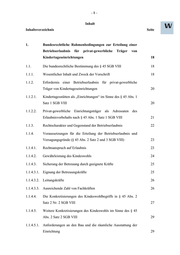 -8- Inhalt Inhaltsverzeichnis Seite 1. Bundesrechtliche Rahmenbedingungen zur Erteilung einer Betriebserlaubnis für privat-gewerbliche Träger von Kindertageseinrichtungen 18 1.1. Die bundesrechtliche Bestimmung des § 45 SGB VIII 18 1.1.1. Wesentlicher Inhalt und Zweck der Vorschrift 18 1.1.2. Erfordernis einer Betriebserlaubnis für privat-gewerbliche Träger von Kindertageseinrichtungen 20 1.1.2.1. Kindertagesstätten als „Einrichtungen“ im Sinne des § 45 Abs. 1 Satz 1 SGB VIII 20 1.1.2.2. Privat-gewerbliche Einrichtungsträger als Adressaten des Erlaubnisvorbehalts nach § 45 Abs. 1 Satz 1 SGB VIII 21 1.1.3. Rechtscharakter und Gegenstand der Betriebserlaubnis 22 1.1.4. Voraussetzungen für die Erteilung der Betriebserlaubnis und Versagungsgründe (§ 45 Abs. 2 Satz 2 und 3 SGB VIII) 23 1.1.4.1. Rechtsanspruch auf Erlaubnis 23 1.1.4.2. Gewährleistung des Kindeswohls 24 1.1.4.3. Sicherung der Betreuung durch geeignete Kräfte 25 1.1.4.3.1. Eignung der Betreuungskräfte 25 1.1.4.3.2. Leitungskräfte 26 1.1.4.3.3. Ausreichende Zahl von Fachkräften 26 1.1.4.4. Die Konkretisierungen des Kindeswohlbegriffs in § 45 Abs. 2 Satz 2 Nr. 2 SGB VIII 27 1.1.4.5. Weitere Konkretisierungen des Kindeswohls im Sinne des § 45 Abs. 2 Satz 2 SGB VIII 29 1.1.4.5.1. Anforderungen an den Bau und die räumliche Ausstattung der Einrichtung 29