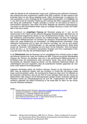 2 sollte das Mandat für die multinationale Truppe nach „Vollendung des politischen Prozesses“, also entsprechend dem vorgesehenen Zeitplan Ende 2005, auslaufen. Da aber wiederum kein konkretes Datum für den Abzug festgelegt wurde, hätten Verzögerungen im politischen Pro- zess automatisch zu einer Verlängerung der Truppenstationierung geführt. Im 3. Entwurf vom 4. Juni 2004 wurde der irakischen Regierung dann erstmals das Recht zugestanden, jederzeit den Abzug der ausländischen Truppen verlangen zu können. Es wird jedoch als höchst un- wahrscheinlich angesehen, dass dieser Fall eintritt. Mitglieder der irakischen Übergangsregie- rung haben vor dem Sicherheitsrat erklärt, dass ein vorzeitiger Rückzug zu Chaos und Instabi- lität im Irak führen würde. Der Durchbruch zur endgültigen Fassung der Resolution gelang am 7. Juni, als US- Außenminister Colin Powell und der irakische Übergangs-Ministerpräsident Ijad Allawi sich mit zwei aufeinander abgestimmten Briefen an den UN-Sicherheitsrat wandten. Darin ist die künf- tige militärische Zusammenarbeit zwischen den Koalitionstruppen und dem Irak festgelegt. Gemeinsame Militärausschüsse mit Vertretern der irakischen Sicherheitskräfte und der MNF sollen eine „enge Abstimmung und Konsultation“ bei Militäroperationen sicherstellen. Diese militärische Partnerschaft soll vor allem den Eindruck vermeiden, der Irak sei nicht wirklich souverän und verfüge in Sicherheitsfragen nur über geringes Mitspracherecht. Beide Briefe wurden der Resolution 1546 beigefügt und sind damit Teil der Resolution. Nicht durchsetzen konnte sich die u. a. von Frankreich, Deutschland, Russland und China vorgetragene Forde- rung nach einem Veto des Irak bei Militäreinsätzen der MNF. In der Öffentlichkeit stieß die Resolution auf ein zwiespältiges Echo. Kritisiert wurde vor allem das fehlende Vetorecht der Iraker bei Einsätzen der MNF. Aufgrund des großen Machtgefälles zwischen den Partnern sei absehbar, dass sich in den gemeinsamen Militärausschüssen im Konfliktfall immer die amerikanische Seite durchsetzen werde. Dies könne Zweifel an der Souveränität der irakischen Regierung wecken und den irakischen Widerstand stärken. Als unbefriedigend wird auch angesehen, dass die ausländischen Soldaten gegenüber der iraki- schen Justiz weiterhin Immunität genießen. Insgesamt überwiegen jedoch die positiven Stimmen. Danach ist das Dokument ein Indiz dafür, dass die westlichen Staaten nach den Konflikten im Vorfeld des Irak-Krieges wieder enger zusammenarbeiten wollen. Die amerikanische Regierung habe durch ihre Mitarbeit an der Resolution unterstrichen, dass sie die UNO für einen wichtigen Akteur bei der Lösung von Weltkonflikten halte. Dadurch sei die Weltorganisation gestärkt worden. Außerdem verleihe die Resolution sowohl der Übergangsregierung als auch der Truppenpräsenz der MNF völker- rechtliche Legitimität. Die weitere Entwicklung im Irak werde aber vor allem von der Umset- zung der Resolution abhängen. Quellen: Deutsche Übersetzung der Resolution: http://www.un.org/Depts/german/gts/fs_nav.html „Freibrief für die Besatzer“, in: Berliner Zeitung vom 9.6.2004 „Entschließung“, in: Frankfurter Allgemeine vom 9.6.2004 „Diplomatie im Zwischenhoch“, in: Süddeutsche Zeitung vom 9.6.2004 „Eine militärische Partnerschaft im Irak“, in: Neue Züricher Zeitung vom 8.6.2004 Internet: www.diepresse.com, www.dw-world.de Bearbeiter: Michael Harsch (Praktikant), ORR Prof. Dr. Thomas v. Winter, Fachbereich II: Auswärti- ges, Internationales Recht, Wirtschaftliche Zusammenarbeit und Entwicklung, Verteidi- gung, Menschenrechte und Humanitäre Hilfe