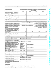 Deutscher Bundestag – 19. Wahlperiode –3– Drucksache 19/29113 Vorabfassung - wird durch die lektorierte Version ersetzt. Förderprogramme CO2-Einsparungen (in Millionen Tonnen CO2-Äquivalente kumuliert, NAPE-Logik) 2016 2017 2018 2019 Förderprogramm zur Abwärmever- meidung und Abwärmenutzung in gewerblichen Unternehmen 0,05 0,16 0,87 1,27 Förderprogramm: Stromeinsparungen im Rahmen wettbewerblicher Aus- schreibungen: Stromeffizienzpotenti- ale nutzen (STEP up!) 0,01 0,01 0,03 0,05 HZO – Förderprogramm Heizungsop- timierung 0,01 0,05 0,08 0,09 Programm erst 2019 gestartet Wird derzeit im Rahmen einer Bundesförderung für Energieeffizienz Evaluation ermittelt (Ergebnisse in der Wirtschaft – Förderwettbewerb erwartet für Mai 2021) Bundesförderung für Energieeffizienz Programm erst 2019 gestartet Wird derzeit im Rahmen einer in der Wirtschaft – Zuschuss und Evaluation ermittelt (Ergebnisse Kredit erwartet für Mai 2021) CO2-Gebäudesanierungs-programm (Nichtwohngebäude), durchgeführt als „Energieeffizient Bauen und Sa- nieren“ (EBS) 0,27 0,34 0,42 0,43 CO2-Gebäudesanierungs-programm (Wohngebäude), durchgeführt als „Energieeffizient Bauen und Sanie- ren“ (EBS) 5,75 5,86 8,02 7,85 Marktanreizprogramm (MAP) 1,44 1,83 2,14 2,41 Bundesförderung für effiziente Programm erst 2021 gestartet Gebäude (BEG) Bundesprogramm zur Steigerung der Energieeffizienz und CO2-Einsparung Programm erst 2020 gestartet in Landwirtschaft und Gartenbau Nationale Klimaschutzinitiative: För- noch keine deraufruf für investive Kommunale Projekte siehe Anmerkung Klimaschutz-Modellprojekte abgeschlossen Nationale Klimaschutzinitiative: noch keine Förderaufruf Klimaschutz durch Projekte siehe Anmerkung Radverkehr abgeschlossen Nationale Klimaschutzinitiative: siehe Anmerkung Kälte-Klima-Richtlinie 1,50 1,60 Nationale Klimaschutzinitiative: Kommunalrichtlinie (nur investive siehe Anmerkung Förderung) 3,56 3,96 Nationale Klimaschutzinitiative: Programm erst siehe Anmerkung Kleinserien-Richtlinie 2018 gestartet Nationale Klimaschutzinitiative: Programm erst 2021 gestartet Mikro-Depot-Richtlinie Nationale Klimaschutzinitiative: Programm erst 2021 gestartet E-Lastenrad-Richtlinie Förderprogramm: Dekarbonisierung Programm erst 2021 gestartet der Industrie Anmerkung: Die Treibhausgas-(THG-)Minderungsbeiträge der investiven Nationale Klima- schutzinitiative-(NKI-)Programme werden durch Ex-Post-Evaluierungen ermit-
