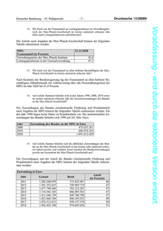 Deutscher Bundestag – 19. Wahlperiode –5– Drucksache 19/28889 Vorabfassung - wird durch die lektorierte Version ersetzt. 12. Wie hoch war der Frauenanteil an Leitungspositionen im Verwaltungsbe- reich der Max-Planck-Gesellschaft im letzten statistisch erfassten Jahr (bitte nach Leitungsfunktionen aufschlüsseln)? Die Anteile nach Angaben der Max-Planck-Gesellschaft können der folgenden Tabelle entnommen werden: MPG 31.12.2020 Frauenanteil (in Prozent) Verwaltungsleiter der Max-Planck-Institute 43,4 Leitungspositionen in der Generalverwaltung 47,1 13. Wie hoch war der Frauenanteil an allen befristet Beschäftigten der Max- Planck-Gesellschaft im letzten statistisch erfassten Jahr? Nach Kenntnis der Bundesregierung lag der Frauenanteil an allen befristet Be- schäftigten (Mitarbeitende mit Arbeitsvertrag über alle Personalkategorien) der MPG im Jahr 2020 bei 41,8 Prozent. 14. Auf welche Summen beliefen sich in den Jahren 1990, 2000, 2010 sowie im letzten statistisch erfassten Jahr die Gesamtzuwendungen des Bundes an die Max-Planck-Gesellschaft? Die Zuwendungen des Bundes (institutionelle Förderung und Projektmittel) nach Angaben der MPG können der folgenden Tabelle entnommen werden. Für das Jahr 1990 liegen keine Daten zu Projektmitteln vor. Die institutionellen Zu- wendungen des Bundes beliefen sich 1990 auf 241 Mio. Euro. Jahr Zuwendung des Bundes an die MPG in Euro 2000 475.653.361 2010 686.954.243 2020 1.091.812.429 15. Auf welche Summe beliefen sich die jährlichen Zuwendungen des Bun- des an die Max-Planck-Gesellschaft in den letzten zehn statistisch erfass- ten Jahren jeweils, und welchen Anteil machten die Bundeszuwendungen jeweils am Gesamtetat der Max-Planck-Gesellschaft aus? Die Zuwendungen und der Anteil des Bundes (institutionelle Förderung und Projektmittel) nach Angaben der MPG können der folgenden Tabelle entnom- men werden: Zuwendung in Euro Anteil Jahr Gesamt Bund (in Prozent) 2011 1.505.540.070 715.425.981 48 2012 1.581.552.625 749.969.719 47 2013 1.677.749.646 782.232.201 47 2014 1.714.543.103 806.495.583 47 2015 1.811.646.139 849.780.798 47 2016 1.823.448.184 886.105.832 49 2017 1.876.512.815 929.157.374 50 2018 1.926.422.108 974.845.626 51