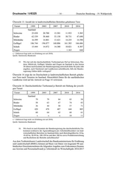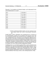 Deutscher Bundestag – 19. Wahlperiode – 11 – Drucksache 19/6325 Übersicht 8: Landwirtschaftliche Betriebe mit Milchkühen nach Größenklassen der LF Betriebsgruppe/LF von … bis unter … ha 1999 2003 2007 2010 2016 Saarland Betriebe mit Milchkühen unter 10 29 15 9 3 2 10 – 50 121 61 28 26 14 50 – 100 152 104 78 67 49 100 – 200 136 128 122 122 100 200 – 500 18 29 30 34 41 500 und mehr - - - - - Insgesamt 456 337 267 252 206 Quelle: Statistisches Bundesamt Übersicht 9: Landwirtschaftliche Betriebe mit Geflügel nach Größenklassen der LF Betriebsgruppe/LF von … 1) bis unter … ha 1999 2003 2007 2010 2016 Saarland Betriebe mit Geflügel unter 10 192 167 131 54 50 10 – 50 169 152 122 116 81 50 – 100 45 47 49 44 37 100 – 200 33 40 36 31 31 200 – 500 6 4 7 6 8 500 und mehr - - - - - Insgesamt 445 410 345 251 207 1) Anzahl der Betriebe mit Haltungsplätzen für Geflügel. Quelle: Statistisches Bundesamt
