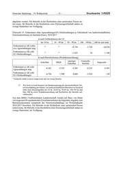 Deutscher Bundestag – 19. Wahlperiode – 15 – Drucksache 19/6325 abgeleitet werden. Für Betriebe in der Rechtsform einer juristischen Person ste hen keine, für Betriebe in der Rechtsform einer Personengesellschaft stehen zu wenige Datensätze zur Verfügung. Übersicht 15: Einkommen ohne Agrarzahlungen/EU-Direktzahlungen je Arbeitskraft von landwirtschaftlichen Einzelunternehmen im Saarland (Euro), 2016/2017 a) nach Größenklassen der LF bis 10 ha 10 – 49 ha 50 – 99 ha 100 – 199 ha 200 ha und mehr Einkommen je AK exklu 1) 1) . . -8.738 -3.720 -10.476 sive Agrarzahlungen insg. Einkommen je AK exkl. 1) 1) . . -1.425 18 -1.188 EU-Direktzahlungen b) nach Betriebsformen (Produktionsrichtung) sonstiger Gemischt- Ackerbau Milch Insgesamt Futterbau betriebe Einkommen je AK exkl. -8.363 -5.325 -3.285 -6.223 -5.501 Agrarzahlungen insg. Einkommen je AK exkl. -4.726 1.948 4.069 -3.924 120 EU-Direktzahlungen 1) Stichprobe enthält in dieser Gruppe keine oder nur wenige Betriebe. 17. Wie hoch ist nach Kenntnis der Bundesregierung die durchschnittliche Net towertschöpfung pro Hektar von landwirtschaftlichen Betrieben im Saarland (bitte nach Betriebsgrößen bis 10 ha, 10-49 ha, 50-99 ha, 100-199 ha und über 200 ha sowie Produktionsrichtung und Rechtsform der Betriebe auf schlüsseln)? Aus dem BMEL-Testbetriebsnetz Landwirtschaft wurden auf Basis von Daten von insgesamt 98 saarländischen Einzelunternehmen die folgenden Angaben zum Betriebseinkommen (entspricht der Nettowertschöpfung) im Wirtschaftsjahr 2016/2017 berechnet. Für Betriebe in der Rechtsform einer juristischen Person stehen keine, für Betriebe in der Rechtsform einer Personengesellschaft stehen zu wenige Datensätze zur Verfügung.