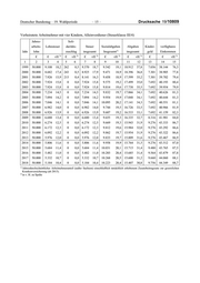 Drucksache 19/10809 – 12 – Deutscher Bundestag – 19. Wahlperiode Verheiratete Arbeitnehmer mit einem Kind, Alleinverdiener (Steuerklasse III/1) Jahres- Soli- arbeits- Lohnsteuer daritäts- Steuer Sozialabgaben Abgaben Kinder- verfügbares 1) Jahr lohn zuschlag insgesamt Insgesamt insgesamt geld Einkommen 2) 2) 2) 2) 2) 2) € € vH € vH € vH € vH € vH € € vH 1 2 3 4 5 6 7 8 9 10 11 12 13 14 15 1999 50.000 9.108 18,2 439 0,9 9.547 19,1 9.542 19,1 19.089 38,2 1.534 32.445 64,9 2000 50.000 8.682 17,4 416 0,8 9.098 18,2 9.471 18,9 18.569 37,1 1.657 33.088 66,2 2001 50.000 7.926 15,9 378 0,8 8.304 16,6 9.458 18,9 17.762 35,5 1.657 33.895 67,8 2002 50.000 7.924 15,8 341 0,7 8.265 16,5 9.575 19,2 17.840 35,7 1.848 34.008 68,0 2003 50.000 7.924 15,8 341 0,7 8.265 16,5 9.814 19,6 18.079 36,2 1.848 33.769 67,5 2004 50.000 7.234 14,5 307 0,6 7.541 15,1 9.832 19,7 17.373 34,7 1.848 34.475 69,0 2005 50.000 7.094 14,2 301 0,6 7.395 14,8 9.954 19,9 17.349 34,7 1.848 34.499 69,0 2006 50.000 7.046 14,1 299 0,6 7.345 14,7 10.095 20,2 17.440 34,9 1.848 34.408 68,8 2007 50.000 6.982 14,0 296 0,6 7.278 14,6 9.744 19,5 17.022 34,0 1.848 34.826 69,7 2008 50.000 6.926 13,9 293 0,6 7.219 14,4 9.607 19,2 16.826 33,7 1.848 35.022 70,0 2009 50.000 6.680 13,4 277 0,6 6.957 13,9 9.655 19,3 16.612 33,2 1.968 35.356 70,7 2010 50.000 6.274 12,5 241 0,5 6.515 13,0 9.669 19,3 16.184 32,4 2.208 36.024 72,0 2011 50.000 6.172 12,3 236 0,5 6.408 12,8 9.812 19,6 16.220 32,4 2.208 35.988 72,0 2012 50.000 6.092 12,2 232 0,5 6.324 12,6 9.862 19,7 16.186 32,4 2.208 36.022 72,0 2013 50.000 5.976 12,0 226 0,5 6.202 12,4 9.833 19,7 16.035 32,1 2.208 36.173 72,3 2014 50.000 5.806 11,6 217 0,4 6.023 12,0 9.958 19,9 15.981 32,0 2.208 36.227 72,5 2015 50.000 5.684 11,4 208 0,4 5.892 11,8 10.031 20,1 15.923 31,8 2.256 36.333 72,7 2016 50.000 5.482 11,0 197 0,4 5.679 11,4 10.203 20,4 15.882 31,8 2.280 36.398 72,8 2017 50.000 5.332 10,7 187 0,4 5.519 11,0 10.268 20,5 15.787 31,6 2.304 36.517 73,0 2018 50.000 5.184 10,4 176 0,4 5.360 10,7 10.223 20,4 15.583 31,2 2.328 36.745 73,5 1) Jahresdurchschnittlicher Arbeitnehmeranteil (außer Sachsen) einschließlich tatsächlich erhobenem Zusatzbeitragssatz zur gesetzlichen Krankenversicherung (ab 2015). 2) in v. H. zu Spalte 2