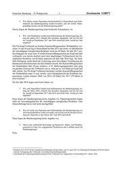 Deutscher Bundestag Drucksache 19/8071 19. Wahlperiode 28.02.2019 Antwort der Bundesregierung auf die Kleine Anfrage der Abgeordneten Judith Skudelny, Frank Sitta, Renata Alt, weiterer Abgeordneter und der Fraktion der FDP – Drucksache 19/7686 – Nachhaltigkeit von Tragetaschen Vorbemerkung der Fragesteller In der öffentlichen Debatte stehen Plastiktüten symbolisch für die Umweltver schmutzung mit Kunststoffgegenständen. Bei vielen ist das Thema verknüpft mit Plastikmüllstrudeln in den Ozeanen. Der Verbraucher, der sich ökologisch und verantwortungsbewusst verhalten möchte, greift seit Mitte 2016 durch die freiwillige Selbstverpflichtung vieler Supermärkte zur Papiertüte. Für 15 Cent erkauft sich der Bürger ein Ökobe wusstsein. So erhält man zum Beispiel im Rewe Supermarkt Papiertüten mit dem Aufdruck „Hallo Umwelt!“. Doch verringert der Verbraucher durch seine Entscheidung an der Supermarktkasse die Umweltverschmutzung nicht. Für die Produktion von Papiertüten ist der Materialaufwand höher als bei Kunst stofftragetaschen (www.sueddeutsche.de/wirtschaft/plastiktueten-deutschland- 1.4005705). Das liegt zum Beispiel daran, dass die Papiertüte, um die gleiche Reißfestigkeit zu gewährleisten, dicker ist als die Kunststofftüte. Es ist erwie sen, dass Papiertüten mehrfach verwendet werden müssen, um ökobilanziell gleichwertig mit der einmaligen Nutzung einer Kunststofftüte zu sein (www. sueddeutsche.de/wirtschaft/recycling-die-groessten-muell-mythen-des-alltags- 1.3490012). Auch beim Transport der Papiertüten ist der CO2-Ausstoß durch das höhere Gewicht größer. In der globalen Betrachtung muss darauf geachtet werden, welchem Verwertungsweg die Tragetasche nach ihrem Verwendungs weg zugeführt wird. In manchen Entwicklungsländern macht z. B. das Verbot von Plastiktüten derzeit Sinn, da das Müllsammelsystem nicht geschlossen ist. Die Papiertüten, die in z. B. Ruanda häufig in der Umwelt landen, zersetzen sich, die Kunststofftüten tun dies nicht. Dagegen ist in Deutschland eine funk tionierende Abfallwirtschaft etabliert, die eine Sammlung und Aufbereitung des Abfalls beinhaltet. Die Antwort wurde namens der Bundesregierung mit Schreiben des Bundesministeriums für Umwelt, Naturschutz und nukleare Sicherheit vom 26. Februar 2019 übermittelt. Die Drucksache enthält zusätzlich – in kleinerer Schrifttype – den Fragetext.