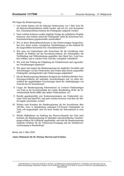 Drucksache 19/17648 –2– Deutscher Bundestag – 19. Wahlperiode Wir fragen die Bundesregierung: 1. Auf welche Summe soll die bisherige Fördersumme von 1 Mrd. Euro für die Batteriezellenproduktion erhöht werden, und auf wie viele Konsortien bzw. Einzelunternehmen könnten die Fördergelder aufgeteilt werden? 2. Nach welchen Kriterien werden mögliche Erträge der geförderten Projekte bemessen, und welchen Anteil der Fördergelder sollen die Konsortien bzw. Einzelunternehmen gegebenenfalls zurückzahlen? 3. Wie ist dieser Rückzahlmechanismus in den Förderverträgen festgeschrie- ben, bzw. durch welche vertraglichen Verpflichtungen ist dies bindend für die ausgewählten Konsortien bzw. Einzelunternehmen? 4. Was muss ein Unternehmen oder Konsortium für die Gewährung einer Beihilfe im Hinblick auf das Investitionsvolumen, die Arbeitsplätze, die Tarifbindung und Mitbestimmung gegenüber dem Bund bzw. Land kon- kret erfüllen, und in welcher Form wird dies vertraglich verbindlich? 5. Wie wird eine Prüfung der Einhaltung der Förderkriterien und zugesicher- ten Vereinbarungen organisiert? 6. Wie agiert und reagiert die Bundesregierung bei möglichen Verstößen und Abweichungen von den Förderzielen, und werden dann bereits ausgezahlte Fördergelder zurückgefordert oder Förderzusagen aufgehoben? 7. Hat die Bundesregierung Bedenken bezüglich des beihilferechtlichen Noti- fizierungsverfahrens der laufenden Ausschreibungen und vor allem hin- sichtlich der angekündigten Erweiterungen durch die Ankündigungen von Tesla bei der EU-Kommission? 8. Liegen der Bundesregierung Informationen zu weiteren Förderanträgen von Tesla an die Investitionsbank des Landes Brandenburg (ILB), die In- vestitionsbank Berlin (IBB) oder andere Förderinstitute vor? 9. Besteht gegebenenfalls eine Konkurrenzsituation um Fördermittel zwi- schen Tesla und Opel/PSA, und nach welchen Kriterien wird über die Mit- telvergabe entschieden werden? 10. Werden nach Kenntnis der Bundesregierung die bei Investitionen über 100 Mio. Euro in Brandenburg zulässigen 6,8 Prozent Fördergelder an Tesla voll ausgeschöpft, und wie hoch werden die Subventionen in etwa sein? 11. Welche Maßnahmen zur Senkung des Wasserverbrauchs hat Tesla nach Kenntnis der Bundesregierung im laufenden umweltrechtlichen Genehmi- gungsverfahren für Grünheide angekündigt, und sieht die Bundesregierung mögliche Gefahren für die Trinkwasserversorgung und die Schmutzwas- serentsorgung in Brandenburg? Berlin, den 2. März 2020 Amira Mohamed Ali, Dr. Dietmar Bartsch und Fraktion Gesamtherstellung: H. Heenemann GmbH & Co. KG, Buch- und Offsetdruckerei, Bessemerstraße 83–91, 12103 Berlin, www.heenemann-druck.de Vertrieb: Bundesanzeiger Verlag GmbH, Postfach 10 05 34, 50445 Köln, Telefon (02 21) 97 66 83 40, Fax (02 21) 97 66 83 44, www.betrifft-gesetze.de ISSN 0722-8333