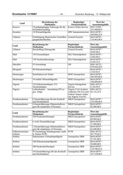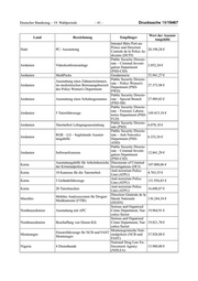 Drucksache 19/19467 – 44 – Deutscher Bundestag – 19. Wahlperiode Bezeichnung der Begünstigte Wert der Land Maßnahme Partnerbehörde Ausstattungshilfe Kosovo 10 geländegängige Fahrzeuge für die Kosovo Police Service 0625 53205 / Grenzüberwachung 161.900,00 € Kroatien 10 Wärmebildgeräte HRV Innenministerium 0610 68707 / 344.066,18 € Libanon Ertüchtigung libanesischer Grenzüber- General Security 0610 68707 / gangskontrollstellen 134.465,08 € Bezeichnung der Begünstigte Wert der Land Maßnahme Partnerbehörde Ausstattungshilfe Libanon Beschaffung Klimageräte General Security 0610 68707 / 4.693,40 € Mali 150 Forensiklupen MLI Nationalpolizei 0610 68707 / 5.842,86 € Mali 150 Taschenmikroskope MLI Nationalpolizei 0610 68707 / 4.345,32 € Marokko IT-Ausstattung GR 0501 68723 / 470.644,30 € Mongolei 40 Dokumentenlupen 0610 68707 / 1.635,83 € Montenegro Streifenboot mit Trailer MNE Grenzpolizei 0610 68707 / 369.505,00 € Montenegro 10 mobile Wärmebildgeräte MNE Grenzpolizei 0610 68707 / 140.000,00 € Nigeria 110 Dokumentenlupen, UV- Nigeria Immigration 0501 68723 / Taschenlampen Service 5.182,94 € Nigeria Luftsicherheit – Ausstattung FH La- Nigeria Civil Aviation 0501 68723 / gos, Abuja Authority (NCAA) und 82.132,22 € Federal Airport Autho- rity Nigeria /FAAN) Nordmazedonien 8 Einsatzfahrzeuge für den Kontroll- MKD Grenzpolizei 0610 68707 / und Streifendienst 129.200,00 € Nordmazedonien 4 Einsatzfahrzeuge (Mannschaftswa- MKD Grenzpolizei 0610 68707 / gen) für mindestens 8 Personen 82.048,00 € Bezeichnung der Begünstigte Wert der Land Maßnahme Partnerbehörde Ausstattungshilfe Nordmazedonien 344 Passkontrollstempel MKD Grenzpolizei 0610 68707 / 69.969,60 € Nordmazedonien 6 zivile Einsatzfahrzeuge MKD Grenzpolizei 0610 68707 / 73.500,00 € Nordmazedonien 2 Einsatzfahrzeuge (Mannschaftswa- MKD Grenzpolizei 0610 68707 / gen) für mindestens 16 Personen 62.040,00 € Palästinensischen IT-Ausstattung Schulungsraum/ mobi- PCPS 0501 68723 / Gebiete le Trainer PCPS 50.779,82 € Serbien Dokumenten-/Urkundenprüfgerät Grenzpolizei SRB 0610 68707 / 55.741,00 € Serbien 100 Dokumentenprüfgeräte Grenzpolizei SRB 0610 68707 / 30.000,00 € Serbien 200 Passkontrollstempel Grenzpolizei SRB 0610 68707 / 139.708,93 € Serbien 10 Einsatzfahrzeuge für den Kontroll- Grenzpolizei SRB 0610 68707 / und Streifendienst 167.230,00 €