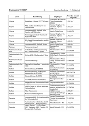 Deutscher Bundestag – 19. Wahlperiode – 43 – Drucksache 19/19467 Wert der Ausstat- Land Bezeichnung Empfänger tungshilfe Direction Générale de la begleitende Ausstattungshilfe zum Sûreté Nationale Tunesien Lehrgang Tatortarbeit nach Spreng- 2.438,88 € (DGSN) / Garde Natio- und Branddelikten (Aufbau) nale (GN) Ausstattungshilfe für Arbeitsbereiche Directorate of Criminal Uganda 69.662,70 € der Kriminalpolizei Investigations Hochwertige Kameras (Video und Criminal Investigations Uganda 14.913,52 € Spiegelreflex + Zubehör) Directorate (Forensics) Bundespolizei Bezeichnung der Begünstigte Wert der Land Maßnahme Partnerbehörde Ausstattungshilfe Ägypten 13 Streifenfahrzeuge Grenzpolizei 0501 68734 / 353.677,34 € Ägypten 10 Streifen- und Transportfahrzeuge Grenzpolizei 0501 68734 / für Sicherheitskräfte 402.000,00 € Ägypten Instandsetzung ETD-Gerät Ministerium für zivile 0501 68734 / Luftfahrt 7.586,57 € Albanien Erdbebenhilfe ALB Grenzpolizei 0610 68707 / 4.560,00 € Algerien 100 Dokumentenlupen, 200 Faltlupen DZA Grenzpolizei 0610 68707 / 4.796,30 € Äthiopien 5 Stereomikroskope ETH Grenzpolizei 0610 68707 / 29.172,06 € Bosnien- 2 Bombenschutzanzüge BIH Grenzpolizei 0610 68707 / Herzegowina 199.603,57 € Bosnien- 10 mobile Wärmebildgeräte BIH Grenzpolizei 0610 68707 / Herzegowina 140.000,00 € Gambia Medien- und Büroausstattung für Gambia Immigration 6002 68703 / Schulungsräume (Trainingscontainer) Department 4.098,21 € Bezeichnung der Begünstigte Wert der Land Maßnahme Partnerbehörde Ausstattungshilfe Gambia Solarmodul für Schulungscontainer Gambia Immigration 6002 68703 / Department 54.733,00 € Gambia Bauliche Einfriedung des Trainings- Gambia Immigration 6002 68703 / centers Department 33.051,00 € Ghana 50 Forensiklupen Ghana Immigration Ser- 0610 68707 / vice 6.131,15 € Ghana Dokumentenprüfgerät INSPEC 8 + Ghana Immigration Ser- 0610 68707 / APC + Drucker vice 18.430,66 € Ghana APC, Notebook Ghana Immigration Ser- 0610 68707 / vice 331,80 € Jordanien Interaktives Board / Beamer zur Aus- Gendarmerie 0501 68723 / stattung eines Fortbildungsraumes 10.546,73 € Jordanien Machbarkeitsanalyse zur baulichen Gendarmerie 6002 68703 / Implementierung einer Diensthunde- 102.335,29 € schule