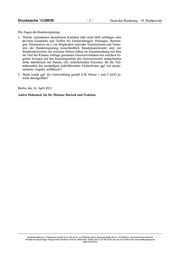 Drucksache 19/29030 –2– Deutscher Bundestag – 19. Wahlperiode Wir fragen die Bundesregierung: 1. Welche vereinbarten dienstlichen Kontakte (alle nicht bloß zufälligen oder privaten Gespräche und Treffen bei Veranstaltungen, Sitzungen, Beratun- gen, Dienstreisen etc.) von Mitgliedern und/oder Vertreterinnen und Vertre- tern der Bundesregierung (einschließlich Bundeskanzleramt) oder der Bundesministerien mit externen Dritten haben im Zusammenhang mit dem im Titel der Kleinen Anfrage genannten Gesetzesvorhaben mit welchem Er- gebnis bezogen auf den Regelungsinhalt des Gesetzentwurfs stattgefunden (bitte tabellarisch mit Datum, Ort, teilnehmenden Personen, für die Teil- nehmenden des zuständigen federführenden Fachreferates ggf. mit anony- misierter Angabe, aufführen)? 2. Wann wurde ggf. die Unterrichtung gemäß § 48 Absatz 1 und 2 GGO je- weils durchgeführt? Berlin, den 16. April 2021 Amira Mohamed Ali, Dr. Dietmar Bartsch und Fraktion Gesamtherstellung: H. Heenemann GmbH & Co. KG, Buch- und Offsetdruckerei, Bessemerstraße 83–91, 12103 Berlin, www.heenemann-druck.de Vertrieb: Bundesanzeiger Verlag GmbH, Postfach 10 05 34, 50445 Köln, Telefon (02 21) 97 66 83 40, Fax (02 21) 97 66 83 44, www.betrifft-gesetze.de ISSN 0722-8333