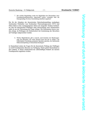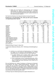 Drucksache 19/28421 –4– Deutscher Bundestag – 19. Wahlperiode Vorabfassung - wird durch die lektorierte Version ersetzt. 5. Welche sind, nach Kenntnis der Bundesregierung, die 20 häufigsten Muttersprachen, die – abgesehen von der Sprache Deutsch – in den Jahren 2015 bis 2020 in Deutschland gesprochen wurden (bitte ein Ranking pro Jahr sowie jeweils die prozentuale und absolute Anzahl der Personen, die diese Sprachen sprechen, angeben)? Das Statistische Bundesamt hat folgende Sonderauswertung bereitgestellt. Bevölkerung in Privathaushalten 2017, 2018 und 2019 nach im Haushalt vorwiegend gesprochener Sprache 2017 2018 2019 Insgesamt Insgesamt Insgesamt in 1 000 in % in 1 000 in % in 1 000 in % 1 2 3 4 5 6 Insgesamt 81 740 100 81 613 100 81 848 100 Deutsch 69 534 85,2 71 975 88,2 72 001 88,2 Türkisch 1 535 1,9 1 640 2,0 1 632 2,0 Russisch 1 219 1,5 1 209 1,5 1 220 1,5 Arabisch 786 1,0 887 1,1 864 1,1 Polnisch 692 0,8 747 0,9 756 0,9 Rumänisch – – – – 461 0,6 Englisch 385 0,5 417 0,5 425 0,5 Italienisch 373 0,5 391 0,5 393 0,5 Spanisch 285 0,3 308 0,4 325 0,4 Französisch 118 0,1 120 0,1 105 0,1 Andere europäische Sprache 1 867 2,3 2 053 2,5 1 782 2,2 Andere afrikanische Sprache 304 0,4 319 0,4 318 0,4 Andere asiatische Sprache 658 0,8 710 0,9 761 0,9 Sonstige Sprache 723 0,9 758 0,9 756 0,9 Ohne Angabe 3 261 4,0 79 0,1 50 0,1 Quelle: Mikrozensus Sonderauswertung F2 Stand: 29. März 2021 © Statistisches Bundesamt (Destatis), 2021: Verbreitung mit Quellenangabe ge- stattet. 6. Inwiefern war es, nach Kenntnis der Bundesregierung, in der Vergangen- heit möglich, für die theoretische Führerscheinprüfung einen Fremd- sprachendolmetscher zu beauftragen (bitte nach Ländern aufgliedern)? a) In welchen Sprachen und ich welchem Umfang wurde von dieser Möglichkeit, nach Kenntnis der Bundesregierung, Gebrauch gemacht (bitte nach Ländern sowie nach Sprachen aufgliedern)? b) Welche Anforderungen mussten Fremdsprachendolmetscher erfüllen, um als Dolmetscher für die theoretische Führerscheinprüfung zuge- lassen zu werden (bitte hierbei insbesondere auf den Aspekt der Ver- eidigung eingehen)? Bis zum Inkrafttreten der „Fünften Verordnung zur Änderung der Fahrerlaub- nis-Verordnung und anderer straßenverkehrsrechtlicher Vorschriften“ vom 7. Januar 2011 am 19. Januar 2013 konnten nach Anlage 7 Nummer 1.3 der Fahrerlaubnis-Verordnung die zuständigen obersten Landesbehörden zulassen, dass die Fragen in der theoretischen Prüfung unter Hinzuziehung eines beeidig- ten oder eines öffentlich bestellten und vereidigten Dolmetschers oder Überset- zers auf Kosten des Bewerbers gestellt werden. Im Übrigen liegen der Bundesregierung keine eigenen Erkenntnisse vor.