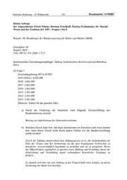Deutscher Bundestag – 19. Wahlperiode – 285 – Drucksache 19/10481 c) Wenn es Ausschreibungen zu etwaigen Auftragsarbeiten gab, welche weiteren Mitbewerber gab es und welches konkrete (Auswahl-)Verfahren kam zur Anwendung? Zu Frage 8 Wurde der Institution jemals die Unterstützung aufgrund unzureichender Verfolgung des Förderzwecks entzogen? Wenn ja, wie wurde der Entzug begründet? Nein.