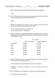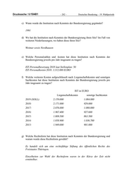 Deutscher Bundestag – 19. Wahlperiode – 287 – Drucksache 19/10481 c) Wann wurde die Institution nach Kenntnis der Bundesregierung gegründet? 1994 d) Wo hat die Institution nach Kenntnis der Bundesregierung ihren Sitz? Im Fall von weiteren Niederlassungen, wo haben diese ihren Sitz? Berlin e) Welche Personalzahlen und -kosten hat diese Institution nach Kenntnis der Bundesregierung jeweils pro Jahr insgesamt zu tragen? IST-Personalbesetzung 2018 laut Stellenplan: 31 IST-Personalkosten 2018: 1.794.000 Euro f) Welche weiteren Kosten aufgeschlüsselt nach Liegenschaftskosten und sonstigen Sachkosten hat diese Institution nach Kenntnis der Bundesregierung jeweils pro Jahr insgesamt zu tragen? IST in EURO Liegenschaftskosten sonstige Sachkosten 2019 (SOLL): 619.000 1.735.000 2018: 623.000 1.716.000 2017: 702.000 1.630.000 2016: 469.000 615.000 2015: 432.000 660.000 2014: 471.000 526.000 2013: 393.000 550.000 g) Welche Rechtsform hat diese Institution nach Kenntnis der Bundesregierung und warum wurde diese Rechtsform gewählt? nichtrechtsfähige Stiftung des öffentlichen Rechts des Landes Berlin Einzelheiten zur Wahl der Rechtsform waren in der Kürze der Zeit nicht ermittelbar. h) Wie viele Mitglieder hat die Institution nach Kenntnis der Bundesregierung? Die Institution hat keine Mitglieder.