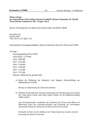Drucksache 19/10481 – 286 – Deutscher Bundestag – 19. Wahlperiode Kleine Anfrage der Abgeordneten Ulrich Oehme, Dietmar Friedhoff, Markus Frohnmaier, Dr. Harald Weyel und der Fraktion der AfD – Fragen 1 bis 8 Ressort: Die Beauftragte der Bundesregierung für Kultur und Medien (BKM) Einzelplan: 04 Kapitel: 0452 Titel: 685 61, Erl.-Ziffer 1.3.4 Institutioneller Zuwendungsempfänger: Stiftung Gedenkstätte Deutscher Widerstand (GDW) Zu Frage 1 Zuwendungsbetrag IST in EURO 2019 (SOLL): 4.139.000 2018: 3.889.000 2017: 3.555.000 2016: 1.796.000 2015: 1.760.000 2014: 1.753.000 2013: 1.747.000 (Hinweis: Zahlen für das gesamte Jahr) a) Durch die Förderung der Institution wird folgende Zweckerfüllung aus Bundesinteresse erreicht: Beitrag zur Aufarbeitung des Nationalsozialismus b) Welchen Zweck hatte bzw. hat diese Institutionen im Einzelnen und wieso konnte bzw. kann dieser Zweck nicht durch andere Stellen wie die Bundesverwaltung erfüllt werden? Laut Errichtungsstatut: wachhalten des Andenkens der Frauen und Männer im Widerstand gegen den Nationalsozialismus und Förderung der notwendigen Auseinandersetzung der Deutschen mit diesem Teil der Geschichte Es handelt sich hier um eine Stiftung in der Trägerschaft eines Landes, an deren Förderung der Bund sich beteiligt.