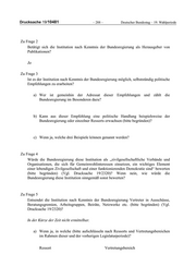 Drucksache 19/10481 – 288 – Deutscher Bundestag – 19. Wahlperiode Zu Frage 2 Betätigt sich die Institution nach Kenntnis der Bundesregierung als Herausgeber von Publikationen? Ja Zu Frage 3 Ist es der Institution nach Kenntnis der Bundesregierung möglich, selbstständig politische Empfehlungen zu erarbeiten? a) Wer ist gemeinhin der Adressat dieser Empfehlungen und zählt die Bundesregierung im Besonderen dazu? b) Kann aus dieser Empfehlung eine politische Handlung beispielsweise der Bundesregierung oder einzelner Ressorts erwachsen (bitte begründen)? c) Wenn ja, welche drei Beispiele können genannt werden? Zu Frage 4 Würde die Bundesregierung diese Institution als „zivilgesellschaftliche Verbände und Organisationen, die sich für Gemeinwohlinteressen einsetzen, ein wichtiges Element einer lebendigen Zivilgesellschaft und einer funktionierenden Demokratie sind“ bewerten (bitte begründen) (Vgl. Drucksache 19/2320)? Wenn nein, wie würde die Bundesregierung diese Institution sinngemäß sonst bewerten? Zu Frage 5 Entsendet die Institution nach Kenntnis der Bundesregierung Vertreter in Ausschüsse, Beratungsgremien, Arbeitsgruppen, Beiräte, Netzwerke etc. (bitte begründen) (Vgl. Drucksache 19/2320)? In der Kürze der Zeit nicht ermittelbar. a) Wenn ja, in welche (bitte aufschlüsseln nach Ressorts und Vertretungsbereichen im Rahmen dieser und der vorherigen Legislaturperiode)? Ressort Vertretungsbereich
