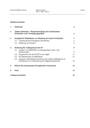 Wissenschaftliche Dienste Dokumentation Seite 3 WD 2 - 3000 - 022/17 Inhaltsverzeichnis 1. Einleitung 4 2. Äußere Sicherheit – Weiterentwicklung der Gemeinsamen Sicherheits- und Verteidigungspolitik 5 3. Europäische Maßnahmen zur Stärkung der Inneren Sicherheit 7 3.1. Umsetzung des Schengener Grenzkodex 7 3.2. Stärkung von Europol 8 4. Sicherung der Außengrenzen der EU 9 4.1. Ausbau von FRONTEX zur Europäischen Grenz- und Küstenwache 9 4.2. Kooperation mit der NATO in der Ägäis 11 4.3. EU-Operationen im Mittelmeer 11 4.4. Hotspots, Multifunktionszentren und weitere Maßnahmen in Drittstaaten zur Verbesserung der Migrationskontrolle 12 5. Reform des Gemeinsamen Europäischen Asylsystems 14 6. Fazit 15 Anlagenverzeichnis 16