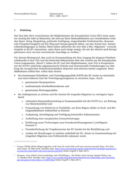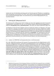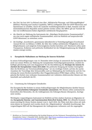 Wissenschaftliche Dienste Dokumentation Seite 10 WD 2 - 3000 - 022/17 Verfügung , für 2017 beläuft sich der Etat auf 302 Millionen Euro. Ein Teil davon floss in die 16 17 Finanzierung der EU-Missionen Poseidon, Triton, Hera, Minerva und Indalo zur Rettung von Menschen im Mittelmeer. Einen Überblick über diese Missionen verschafft das entsprechende 18 Informationsblatt der Europäischen Kommission vom 7. Oktober 2016 (Anlage 7). 19 Zeitgleich zum rasanten Anstieg der zur Verfügung stehenden Mittel betrieb die EU den Umbau der Agentur, der im Laufe des Jahres 2017 abgeschlossen sein soll. In einem Informationsblatt der Europäischen Kommission (Anlage 8) werden unter anderem 20 die Inhalte des Mandates, die Organisation und die neuen Kompetenzen dieser Behörde, der Agentur für die Europäische Grenz- und Küstenwache (FRONTEX) beschrieben. Dazu gehören z.B. die Eigeninitiative bei der Rückführung abgelehnter Asylbewerber oder illegaler Migranten, verstärkter Zugriff auf und Sammlung von Informationen, eine Verdopplung der Personalzahlen, der selbstständige Erwerb von Fahrzeugen und Ausrüstung und die Kooperation mit Drittstaaten. Noch detaillierter werden die Kompetenzen der neuen Behörde in einem 2016 in der Zeitschrift für Rechtspolitik veröffentlichten Beitrag (Anlage 9) von Dr. Ole Schröder, MdB, Parlamentari- 21 scher Staatssekretär beim Bundesminister des Innern, und Polizeidirektor Dr. Lars Gerdes, stell- vertretendes Mitglied im Verwaltungsrat von FRONTEX, erläutert. Hier wird insbesondere ausge- führt, dass die „neue“ FRONTEX unter Umständen auch ohne Ersuchen eines Mitgliedstaates tätig werden kann. Die Europäische Agentur für die Grenz- und Küstenwache nahm ihren Dienst am 6. Oktober 2016 auf; bis Ende März 2017 soll sie erste Gefährdungsanalysen vor- legen. 22 16 Amended Budget 2015 N3, FRONTEX. Abrufbar unter: http://frontex.europa.eu/assets/About_Frontex/Gover- nance_documents/Budget/Budget_2015_N3.pdf (letzter Zugriff: 6. März 2017). 17 Budget 2017, FRONTEX. Abrufbar unter: http://frontex.europa.eu/assets/About_Frontex/Gover- nance_documents/Budget/Budget_2017.pdf (letzter Zugriff: 6. März 2017). 18 EU-Operationen im Mittelmeer. Informationsblatt der Europäischen Kommission vom 4. Oktober 2016. Abrufbar unter: https://ec.europa.eu/home-affairs/sites/homeaffairs/files/what-we-do/policies/securing-eu-borders/fact- sheets/docs/20161006/eu_operations_in_the_mediterranean_sea_de.pdf (letzter Zugriff: 8. März 2017). 19 Ebd. 20 Eine europäische Grenz- und Küstenwache. Hrsg.: Europäische Kommission 2016. Abrufbar unter: https://ec.eu- ropa.eu/home-affairs/sites/homeaffairs/files/what-we-do/policies/securing-eu-borders/fact-sheets/docs/ 20161006/a_european_border_and_coast_guard_de.pdf (letzter Zugriff: 9. März 2017). 21 Schröder, Ole; Gerdes, Lars (2016): Neue Europäische Grenz- und Küstenwache. In: Zeitschrift für Rechtspolitik, 238/2016. 22 Europäische Agentur für die Grenz- und Küstenwache nimmt ihre Arbeit auf, Europäische Kommission am 6. Oktober 2016. Abrufbar unter: http://ec.europa.eu/germany/news/europ%C3%A4ische-agentur-f%C3%BCr-die- grenz-und-k%C3%BCstenwache-nimmt-ihre-arbeit-auf_de (letzter Zugriff: 9. März 2017).