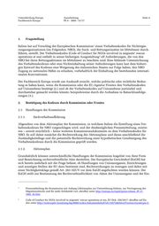 Unterabteilung Europa Ausarbeitung Seite 5 Fachbereich Europa PE 6 - 3000 - 51/17 richtungen oder sonstigen Stellen der Union auf deren Inhalt, also den Wortlaut und den Kon- text, in dem sie stehen , ihr Wesen sowie die Absicht ihres Urhebers ab. Form und Bezeichnung 3 4 5 der Maßnahmen sind hingegen unbeachtlich. 6 Aktionspläne gehören nach Ansicht von Geismann zu den Akten unterschiedlicher Bezeichnung mit zumeist politischer Zielrichtung, die grundsätzlich nicht darauf gerichtet sind, Rechtsver- bindlichkeit zu erzeugen. Der vorliegend in Frage stehende Aktionsplan stellt laut seinem Wort- 7 laut einen „Diskussionsbeitrag der Kommission“ für die informelle Tagung der Minister für Justiz und Inneres vom 6.-7. Juli 2017 dar. Der Aktionsplan enthält seinem Wortlaut und Kontext nach mithin keine rechtsverbindlichen Anweisungen, sondern rechtsunverbindliche Vorschläge. Da- mit steht die Formulierung des Aktionsplans im Einklang, dass „Italien […] in Abstimmung mit der Kommission und nach einem Dialog mit den NRO einen Verhaltenskodex für die an den Such- und Rettungsmaßnahmen beteiligten NRO erstellen [sollte]“, nicht „soll“ oder „muss“ oder „verpflichtet wird“. 2.1.3. (Hypothetische) Genehmigung des Verhaltenskodexes Eine andere mögliche Handlung der Kommission, die Rechtswirkung erzeugen könnte, ist die im Aktionsplan angesprochene „Abstimmung“ des Verhaltenskodexes durch Italien mit der Kom- mission. Laut einem Bericht der italienischen Nachrichtenagentur ANSA hat die Kommission den italienischen Verhaltenskodex am Wochenende vom 15./16. Juli 2017 genehmigt. Es fehlt 8 jedoch an offiziellen Erklärungen der Kommission zum Kodex. Allein aufgrund von Pressebe- richten zu einer Genehmigung des Kodexes durch die Kommission ist keine abschließende Fest- stellung zu der Rechtswirkung einer solchen Genehmigung möglich. Es fehlt an einem Doku- ment, das eine Überprüfung des Wortlauts und Kontextes, seines Wesens und der Absicht des Urhebers zulässt, um anhand dieser Merkmale mögliche Rechtswirkungen festzustellen. Vorlie- gend kann somit nur hypothetisch die Rechtswirkung einer solchen Genehmigung geprüft wer- den. 3 EuGH, Urt. v. 20.3.1997, C‑57/95, EU:C:1997:164 – Frankreich/Kommission, Rn. 18; EuGH, Urt. v. 1.12.2005, C‑301/03, EU:C:2005:727 – Italien/Kommission, Rn. 21 ff. 4 EuGH, Urt. v. 22.6.2000, C‑147/96, EU:C:2000:335 – Niederlande/Kommission, Rn. 27; EuGH, Urt. v. 26.1.2010, C‑362/08 P, EU:C:2010:40 – Internationaler Hilfsfonds/Kommission, Rn. 52. 5 EuGH, Urt. v. 17.7.2008, C‑521/06 P, EU:C:2008:422 – Athinaïki Techniki/Kommission, Rn. 42; EuGH, Urt. v. 26.1.2010, C‑362/08 P, EU:C:2010:40 – Internationaler Hilfsfonds/Kommission, Rn. 52. 6 EuGH, Urt. v. 11.11.1981, C-60/81, EU:C:1981:264 – IBM/Kommission, Rn. 9. 7 Geismann, in: von der Groeben/Schwarze/Hatje, Europäisches Unionsrecht, 7. Aufl. 2015, Art. 288 AEUV, Rn. 23. 8 ANSA, Italy’s migrant NGO code of conduct OK’d by EC, 17.7.2017, abrufbar unter http://www.ansa.it/eng- lish/news/2017/07/17/italys-migrant-ngo-code-of-conduct-okd_14f940a7-8979-440e-8f8d-776069202f54.html.