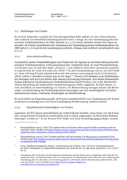 Unterabteilung Europa Ausarbeitung Seite 9 Fachbereich Europa PE 6 - 3000 - 51/17 2.2. Handlungen von Frontex Es wird im Folgenden zunächst die Tatsachengrundlage dafür geklärt, ob eine rechtswirksame oder rechtlich unverbindliche Handlung durch Frontex vorliegt, die eine Genehmigung des itali- enischen Verhaltenskodexes für NRO darstellt (2.2.1.). In einem nächsten Schritt wird dann un- tersucht, ob Frontex hypothetisch die Kompetenz zur Genehmigung eines Verhaltenskodexes für NRO hätte (2.2.2.) und ob die Genehmigung rechtlich wirksam oder rechtlich unverbindlich wäre (2.2.3.). 2.2.1. Sachverhaltsaufklärung Ausweislich zweier Presseerklärungen von Frontex hat die Agentur an der Entwicklung des itali- enischen Verhaltenskodexes Anteil genommen bzw. unterstützt diese. In einer Pressemitteilung von Frontex vom 11. Juli 2017 steht: „Frontex […] are willing to share their operational expertise to help develop the Code of Conduct for NGOs“. In der Pressemitteilung vom 24. Juli 2017 heißt 19 es: “Italy will keep Frontex informed about the discussions concerning the Code of Conduct for NGOs, which it considers a crucial step at this stage.” Frontex will demnach zum Verhaltensko- 20 dex beitragen und wird von Italien über dessen Entwicklung informiert. Aus diesen Pressemittei- lungen folgt keine Genehmigung des Verhaltenskodexes durch Frontex, wie es die oben bereits zitierte Darstellung der italienischen Nachrichtenagentur ANSA suggeriert. Es fehlt mithin, so weit ersichtlich, an einer Handlung von Frontex, die Rechtswirkung erzeugen könnte. Die Bereit- schaft, zur Entwicklung des Verhaltenskodexes beizutragen und sich diesbezüglich von Italien informieren zu lassen, sind keine Handlungen mit Rechtswirkung. Es wird mithin im Folgenden geprüft, ob Frontex hypothetisch für eine Genehmigung des Verhal- tenskodexes zuständig wäre und diese Genehmigung Rechtswirkung entfalten könnte. 2.2.2. (Hypothetische) Zuständigkeit von Frontex Agenturen der EU können grundsätzlich nur rechtswirksam handeln, wenn ihnen von der Union eine entsprechende Kompetenz ausdrücklich und in einem umgrenzten, rechtssicheren Rahmen übertragen worden ist. In der Frontex-VO findet sich keine Ermächtigungsgrundlage, wonach 21 22 19 Pressemitteilung vom 11.7.2017, EU member states and Frontex show support for Italy at meeting to discuss operation Triton, abrufbar unter http://frontex.europa.eu/pressroom/news/eu-member-states-and-frontex-show- support-for-italy-at-meeting-to-discuss-operation-triton-eROj3s. 20 Pressemitteilung vom 24.7.2017, Frontex and Italy hold first meeting of working group on operation Triton, abrufbar unter http://frontex.europa.eu/pressroom/news/frontex-and-italy-hold-first-meeting-of-working-group- on-operation-triton-GW0qgb. 21 Frenz, Handbuch Europarecht, Band 6 – Institutionen und Politiken, 2011, Teil I, § 5 Unionsinstitutionen, Rn. 469 f.; Nettesheim, in: Grabitz/Hilf/Nettesheim, Das Recht der EU, 55. Egl, Stand: Januar 2015, Art. 13 EUV, Rn. 52. 22 Verordnung (EU) 2016/1624 des Europäischen Parlaments und des Rates vom 14. September 2016 über die Eu- ropäische Grenz- und Küstenwache und zur Änderung der Verordnung (EU) 2016/399 sowie zur Aufhebung der Verordnung (EG) Nr. 863/2007, der Verordnung (EG) Nr. 2007/2004 und der Entscheidung 2005/267/EG, ABl. vom 16.9.2016, L 251/1, abrufbar unter http://eur-lex.europa.eu/legal-con- tent/DE/TXT/?uri=CELEX%3A32016R1624.