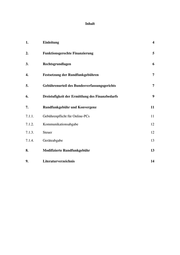 Inhalt 1. Einleitung 4 2. Funktionsgerechte Finanzierung 5 3. Rechtsgrundlagen 6 4. Festsetzung der Rundfunkgebühren 7 5. Gebührenurteil des Bundesverfassungsgerichts 7 6. Dreistufigkeit der Ermittlung des Finanzbedarfs 9 7. Rundfunkgebühr und Konvergenz 11 7.1.1. Gebührenpflicht für Online-PCs 11 7.1.2. Kommunikationsabgabe 12 7.1.3. Steuer 12 7.1.4. Geräteabgabe 13 8. Modifizierte Rundfunkgebühr 13 9. Literaturverzeichnis 14