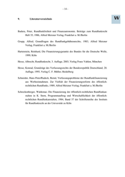 - 14 - 9. Literaturverzeichnis Badura, Peter, Rundfunkfreiheit und Finanzautonomie. Beiträge zum Rundfunkrecht Heft 35, 1986, Alfred Metzner Verlag, Frankfurt a. M./Berlin Grupp, Alfred, Grundfragen des Rundfunkgebührenrechts, 1983, Alfred Metzner Verlag, Frankfurt a. M./Berlin Hartenstein, Reinhard, Die Finanzierungsgarantie des Bundes für die Deutsche Welle, 1999, Köln Hesse, Albrecht, Rundfunkrecht, 3. Auflage, 2003, Verlag Franz Vahlen, München Hesse, Konrad, Grundzüge des Verfassungsrechts der Bundesrepublik Deutschland, 20. Auflage, 1995, Verlag C. F. Müller, Heidelberg Schneider, Hans-Peter/Radeck, Bernd, Verfassungsprobleme der Rundfunkfinanzierung aus Werbeeinnahmen. Zur Vielfalt der Finanzierungsreform des öffentlich- rechtlichen Rundfunks, 1989, Alfred Metzner Verlag, Frankfurt a. M./Berlin Schreckenberger, Waldemar, Die Finanzierung der öffentlich-rechtlichen Rundfunkan- stalten in K. Stern, Programmauftrag und Wirtschaftlichkeit der öffentlich- rechtlichen Rundfunkanstalten, 1984, Band 37 der Schriftenreihe des Instituts für Rundfunkrecht an der Universität zu Köln