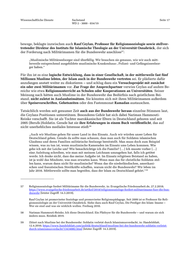 Wissenschaftliche Dienste Sachstand Seite 12 WD 2 - 3000 - 034/19 „Es belegt, dass die Bundesrepublik Deutschland aufgrund ihrer freiheitlichen demokratischen Rechtsordnung und dank ihres aufrichtigen Bemühens, die Vergangenheit nicht zu verdrän- gen, sondern sich ihr zu stellen, es wert ist, geschützt und verteidigt zu werden.“ 33 Der Bund jüdischer Soldaten wurde 2006 gegründet. Er sieht sich selbst zwar in einer Traditions- linie mit dem Reichsbund jüdischer Frontsoldaten, nicht jedoch als dessen Nachfolgeorganisa- tion.34 Gerade angesichts der deutschen Geschichte und vor dem Hintergrund der aktuellen Diskussio- nen um Rechtsextremismus und Fremdenfeindlichkeit in der Bundeswehr sieht der Vorsitzende des Zentralrates der Juden in Deutschland, Josef Schuster, die Chance für jüdische Militärseel- sorger: Diese würden sich nicht nur um die jüdischen Soldaten kümmern, sondern könnten auch Wissenswertes über das Judentum vermitteln und so Judenhass entgegenwirken. 35 In diesem Kontext wurde vom Bundestag im Januar 2018 bereits die Einrichtung des Amtes des Beauftragten der Bundesregierung für jüdisches Leben in Deutschland und den Kampf gegen Antisemitismus beschlossen, das im Bundesministerium des Innern angesiedelt ist. Es wurde an- gesichts der intensiven Diskussion über eine Zunahme des Antisemitismus in Deutschland und der Frage, wie diesem Phänomen bestmöglich auf Ebene des Bundes entgegen getreten werden kann, mit dem aktuellen Koalitionsvertrag neu geschaffen. 36 Bei einem Treffen mit dem Beauftragten, seit 1. Mai 2018 Dr. Felix Klein (CDU/CSU), verdeut- lichte der Geschäftsführer des Zentralrates der Juden in Deutschland, die jüdische Militärseel- sorge sei ein wichtiges Anliegen der jüdischen Gemeinschaft. Zur Stärkung der Inneren Füh- rung und Demokratieausbildung der Soldatinnen und Soldaten sollten auch die Tradition und Kultur des Judentums Thema in der Bundeswehr werden. 37 Insbesondere, weil die Bundeswehr zunehmend auch für junge Juden in Deutschland als Arbeit- geber attraktiv würde, empfahl auch der Vorsitzende des Zentralrates, Schuster, die Streitkräfte sollten dies als Chance begreifen: Militärrabbiner wären seiner Meinung nach insgesamt „ein starkes Zeichen für die Verankerung der Bundeswehr in der Gesellschaft“. 38 So ähnlich bewertet es auch die zum Judentum konvertierte Soldatin Anne Külow. Dass sie 2006 als Offiziersanwärterin zur Bundeswehr ging, verstanden ihre Mitschülerinnen und Mitschüler 33 Fischer/Walter, Sollten Juden in der Bundeswehr dienen? [wie Anm. 27]. 34 Hollenbach, Vom Außenseiter zum Kameraden [wie Anm. 11]. 35 Dillmann, Bundeswehr [wie Anm. 31]. 36 Beauftragter der Bundesregierung für jüdisches Leben in Deutschland und den Kampf gegen Antisemitismus; https://www.bmi.bund.de/DE/ministerium/beauftragte/beauftragter-antisemitismus/beauftragter-antisemitis- mus-artikel.html [letzter Zugriff: 16.3.2019]. 37 Zentralrat der Juden in Deutschland: Pressemitteilung 15.5.2018; https://www.zentralratderjuden.de/aktuelle- meldung/artikel/news/pressemitteilung-150518/ [letzter Zugriff: 16.3.2019]. 38 Dillmann, Bundeswehr [wie Anm. 31].