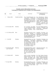 Drucksache V/2046 Deutscher Bundestag — 5. Wahlperiode Tathintergrund und Tathin \\ eise Lfd. Tatort Sachverhalt nach dem Stand Tatzeit Nr. der Ermittlungen 8 26. Juni 1958 Sprendlingen Sprengstoffanschlag auf die Vermutlich Maßnahme des Sendeanlagen des der „Na- sowjetischen Nachrichten- tionalen Arbeitsunion der dienstes gegen die Emigra- Solidaristen" angeschlosse- tion. nen Possev-Verlages. 9 1. Oktober 1958 Hamburg Sprengstoffanschlag auf das Algerisch-französische Aus- Motorschiff „Atlas" im Kai- einandersetzungen. ser-Wilhelm-Hafen. Das zum Transport von Waffen nach Algerien bestimmte Schiff wurde durch 2 Haftminen am Rumpf schwer beschädigt. 10 5. November 1958 Bad Godesberg Ermordung des Mitgliedes Algerisch-französische Aus- der algerischen Delegation einandersetzungen. bei der Tunesischen Bot- schaft, Ait Ahcene, durch mehrere Schüsse aus einer Maschinenpistole. 11 3. März 1959 Frankfurt am Main Sprengstoffattentat auf den Algerisch-französische Aus- Waffenlieferanten der FLN einandersetzungen. Georg Puchert, der durch eine unter dem Pkw ange- brachte Bombe getötet wur- de. 12 15. Oktober 1959 München Attentat auf den Führer der Aktion des sowjetischen „Organisation Ukrainischer Nachrichtendienstes gegen Nationalisten" Stefan Ban- die Emigration. Der Täter dera. Er wurde mit einer Bogdan Staschinskij flüchte- Spezial-Giftpistole getötet. te später in die Bundesrepu- blik und offenbarte sich. 13 12. Dezember 1959 München-Moosach Sprengstoffanschlag auf das Vermutlich Aktion des so- Gebäude des „Zentralver- wjetischen Nachrichtendien- bandes russischer Emigran- stes gegen die Emigration ten". 14 31. Dezember 1959 Frankfurt am Main Sprengstoffattentat auf den Algerisch-französische Aus- Einkäufer der FLN in der einandersetzungen. BRD Abdelkader Yaici alias Nouasri. Er wurde durch ein in Hamburg aufgegebenes Sprengstoffpäckchen schwer verletzt. 15 30. August und Frankfurt am Main 2 Sprengstoffanschläge auf Algerisch-französische Aus- 9. September 1960 den Pkw des Waffenhänd- einandersetzungen. lers Helmut H. Müller. Es entstand lediglich Sachscha- den.