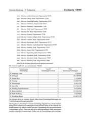 Deutscher Bundestag – 19. Wahlperiode – 17 – Drucksache 19/8305 ooo) Jobcenter Lindau (Bodensee), Trägernummer 83106 ppp) Jobcenter Coburg, Stadt, Trägernummer, 72702 qqq) Jobcenter Dingolfing-Landau, Trägernummer 83502 rrr) Jobcenter Forchheim, Trägernummer 72714 sss) Jobcenter Kulmbach, Trägernummer 72306 ttt) Jobcenter Fürth, Stadt, Trägernummer 72902 uuu) Jobcenter Hof, Stadt, Trägernummer 72308 vvv) Jobcenter Kronach, Trägernummer 72706 www) Jobcenter Kempten (Allgäu), Stadt, Trägernummer 83104 xxx) Jobcenter Landshut, Stadt, Trägernummer 83504 yyy) Jobcenter Memmingen, Stadt, Trägernummer 83112 zzz) Jobcenter München, Landeshauptstadt, Trägernummer 84308 aaaa) Jobcenter Nürnberg, Stadt, Trägernummer 73514 bbbb) Jobcenter Passau, Stadt, Trägernummer 84704 cccc) Jobcenter Regensburg, Stadt, Trägernummer 73904 dddd) Jobcenter Rosenheim, Stadt, Trägernummer 85506 eeee) Jobcenter Schwabach, Stadt, Trägernummer 73524 ffff) Jobcenter Würzburg, Stadt, Trägernummer 75906 (bitte für die einzelnen Jobcenter jeweils getrennt ausweisen)? Die Antwort ergibt sich aus nachstehender Tabelle: Gemeinsame Anzahl Höhe Einrichtung Erstattungsbescheide Erstattungsforderungen JC Augsburg Land 1 818,00 € JC Dillingen 2 28.278,95 € JC Donau-Ries 1 1.123,00 € JC Freising 2 31.606,55 € JC Memmingen 2 6.245,25 € JC Neu-Ulm 2 11.876,21 € JC Neuburg-Schrobenhausen 1 4.475,00 € JC Rhön-Grabfeld 4 23.530,20 € JC Stadt Bamberg 1 7.527,06 € JC Straubing-Bogen 5 62.067,41 € Die übrigen gEen im Freistaat Bayern haben keine Erstattungsforderungen aus Verpflichtungserklärungen gemeldet. Die Angaben zu Anzahl und Volumen der bislang aufgrund von § 68 des Aufent haltsgesetzes erlassenen Erstattungsbescheide beruhen nicht auf der Statistik der Bundesagentur für Arbeit, sondern auf einer Einzelabfrage bei den gemeinsamen Einrichtungen (gEen). Diese von den gEen zurückgemeldeten Daten unterliegen insofern weiterhin Veränderungen. Zudem war die Einzelabfrage nicht stichtags-