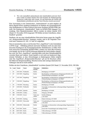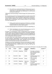 Drucksache 19/6333 – 10 – Deutscher Bundestag – 19. Wahlperiode 8. Wie viele Personen wurden nach Kenntnis der Bundesregierung wegen an timuslimischer und islamfeindlicher Straftaten im dritten Quartal 2018 zu welchen Strafen verurteilt (bitte nach Bundesländern, Art und Motivation der Straftaten aufschlüsseln)? Aufgrund des Sachzusammenhangs werden die Fragen 6 bis 8 gemeinsam beant wortet. Der Generalbundesanwalt beim Bundesgerichtshof hat im dritten Quartal 2018 kein Ermittlungsverfahren wegen mutmaßlicher islamfeindlicher und antimusli mischer Straftaten eingeleitet oder eingestellt. Im Übrigen liegen der Bundesre gierung auch zu Verurteilungen wegen derartiger Straftaten im dritten Quartal 2018 keine Erkenntnisse vor. 9. Welche gezielten bundesweiten Operationen der Polizei hat es nach Kennt nis der Bundesregierung wegen überregionaler antimuslimischer und islam feindlicher Straftaten mit welchem Ergebnis gegeben? Der Bundesregierung liegen keine Informationen im Sinne der Fragestellung vor. 10. Welche Nachmeldungen zu der Antwort der Bundesregierung zu den Fra gen 2, 3 und 4 auf Bundestagsdrucksache 19/3917 gibt es? Im Rahmen von Nachmeldungen werden im KPMD-PMK nicht nur Einzelsach verhalte, sondern auch Änderungen bereits gemeldeter Sachverhalte eingepflegt. Eine gesonderte Auflistung sämtlicher Nachträge ist somit nicht zielführend. Aus diesem Grund werden sämtliche für das zweite Quartal 2018 gemeldeten Delikte in der nachfolgenden Auflistung dargestellt. Im zweiten Quartal 2018 wurden insgesamt zwölf Personen bei zwölf Delikten mit dem Unterthema „Islamfeindlich“ als verletzt gemeldet. Alle zwölf Delikte wurden dem Phänomenbereich PMK -rechts- zugeordnet. Über den jeweiligen Grad der Verletzung liegen beim BKA keine Informationen vor. Straftaten, die aus einer islamfeindlichen Motivation heraus gegen das Angriffs ziel „Religionsstätte/Moschee“ begangen wurden, sind in der folgenden Über sicht unter Nummern 63, 66, 71, 89, 92, 94, 110, 115, 120, 132, 156, 184, 185, 186 und 190 aufgeführt. Delikte mit dem Unterthema „Islamfeindlichkeit“ im zweiten Quartal 2018 Stand: 23. November 2018, 192 Fälle Nr. Land Tatzeit Tatort Phänomen- Zähldelikt § Anzahl TV* bereich 1 ST 07.05.2018 Magdeburg Rechts Verwenden von Kennzei 0 chen verfassungswidriger Organisationen § 86a StGB 2 ST 29.06.2018 Halle Rechts Gefährliche Körperverlet 0 zung § 224 StGB 3 ST 22.06.2018 Osterwieck Rechts Volksverhetzung 0 § 130 StGB 4 ST 15.04.2018 Magdeburg Nicht zuzu Volksverhetzung 0 ordnen § 130 StGB 5 BB 13.06.2018 Potsdam Rechts Gefährliche Körperverlet 2 zung § 224 StGB