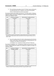 Deutscher Bundestag – 19. Wahlperiode –7– Drucksache 19/8048 Die beim BPatG verfügbaren Zahlen ergeben sich aus folgender Tabelle: Jahr Anzahl der erledigten davon Anteil davon teilweise Anteil Verfahren gesamt Nichtigerklärungen in % Nichtigerklärungen in % 2009 227 47 20,70 32 14,10 2010 242 55 22,73 28 11,57 2011 276 56 20,29 36 13,04 2012 258 59 22,87 35 13,57 2013 262 45 17,18 46 17,56 2014 261 57 21,84 41 15,71 2015 242 34 14,05 42 17,36 2016 206 29 14,08 26 12,62 2017 206 38 18,45 32 15,53 2018 244 59 24,18 39 15,98 12. Wie viele Erteilungen von Patenten wurden in den vergangenen zehn Jahren jeweils pro Jahr abgelehnt? Wie viele Beschwerden gegen diese Bescheide gingen jeweils ein? Wie oft waren diese Beschwerden erfolgreich? Für die Beantwortung der Frage wird davon ausgegangen, dass sich die Frage stellung auf Zurückweisungen von Patentanmeldungen im Prüfungsverfahren be zieht. Die beim DPMA verfügbaren Zahlen ergeben sich aus folgender Tabelle: Jahr Zurückweisungen Beschwerden gegen Zurückweisung 2008 7 855 568 2009 8 584 581 2010 8 310 425 2011 4 637 293 2012 7 437 326 2013 8 114 282 2014 8 031 258 2015 7 819 254 2016 8 228 251 2017 8 345 207 Bei diesen Werten ist zu berücksichtigen, dass es sich um die im jeweiligen Jahr zurückgewiesenen Patentanmeldungen bzw. eingegangenen Beschwerden han delt. Die Bundesregierung erhebt keine Daten zum Ergebnis der Beschwerden gegen Zurückweisungsbeschlüsse. Es werden nur die eingegangenen Beschwerden in Patentsachen insgesamt erfasst; eine Aufschlüsselung danach, wie viele Be schwerden gegen „ablehnende Bescheide“ im Sinne der Zurückweisung einer Pa tentanmeldung eingelegt wurden und davon erfolgreich waren, erfolgt nicht. Die