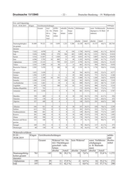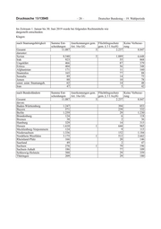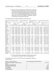 Drucksache 19/13945 – 28 – Deutscher Bundestag – 19. Wahlperiode Im Zeitraum 1. Januar bis 30. Juni 2019 wurde bei folgenden Rechtsmitteln wie dargestellt entschieden: Klagen: nach Staatsangehörigkeit Summe Ent- Anerkennungen gem. Flüchtlingsschutz Keine Verbesse- scheidungen Art. 16a GG gem. § 3 I AsylG rung Gesamt 11.087 3 2.237 8.847 darunter: Syrien 8.540 3 1.889 6.648 Irak 923 55 868 Ungeklärt 466 87 379 Eritrea 404 56 348 Afghanistan 171 11 160 Staatenlos 165 77 88 Somalia 89 14 75 Jemen 88 10 78 sonst. asiat. Staatsangeh. 62 14 48 Iran 47 5 42 nach Bundesländern Summe Ent- Anerkennungen gem. Flüchtlingsschutz Keine Verbesse- scheidungen Art. 16a GG gem. § 3 I AsylG rung Gesamt 11.087 3 2.237 8.847 davon: Baden-Württemberg 1.247 394 853 Bayern 571 239 332 Berlin 1.259 29 1.230 Brandenburg 124 6 118 Bremen 38 2 36 Hamburg 329 14 315 Hessen 1.610 1 644 965 Mecklenburg-Vorpommern 124 9 115 Niedersachsen 1.336 152 1.184 Nordrhein-Westfalen 3.175 1 512 2.662 Rheinland-Pfalz 166 20 146 Saarland 49 2 47 Sachsen 276 1 79 196 Sachsen-Anhalt 186 77 109 Schleswig-Holstein 388 29 359 Thüringen 209 29 180