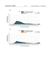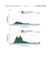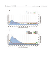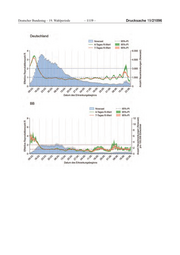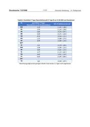 Deutscher Bundestag – 19. Wahlperiode ‒ 1117 ‒ Drucksache 19/21096 Tabelle 2: Geschätzte Anzahl von Neuerkrankungen pro 100.000 Einwohner am 22.06.2020 nach Bundesland BL geschätzte Anzahl Neuerkrankungen 95%-Prädiktionsintervall / 100.000 Einwohner (Punktschätzer) BW 0,3 ( 0,2 - 0,5 ) BY 0,5 ( 0,3 - 0,8 ) BE 1,3 ( 0,7 - 2,0 ) BB 0,4 ( 0,1 - 0,8 ) HB 0,6 ( 0,1 - 1,5 ) HH 0,3 ( 0,1 - 0,7 ) HE 0,5 ( 0,2 - 0,8 ) MV 0,1 ( 0,0 - 0,4 ) NI 0,4 ( 0,2 - 0,7 ) NW 1,1 ( 0,7 - 1,6 ) RP 0,2 ( 0,0 - 0,4 ) SL 0,8 ( 0,1 - 1,8 ) SN 0,2 ( 0,0 - 0,4 ) ST 0,2 ( 0,1 - 0,5 ) SH 0,1 ( 0,0 - 0,3 ) TH 0,2 ( 0,0 - 0,4 ) Tabelle 3: Geschätzte Reproduktionszahl am 22.06.2020 nach Bundesland BL geschätzte Reproduktionszahl 95%-Prädiktionsintervall (Punktschätzer) BW 0,97 ( 0,66 - 1,26 ) BY 1,08 ( 0,80 - 1,50 ) BE 0,54 ( 0,37 - 0,70 ) BB 0,98 ( 0,60 - 1,63 ) HB 0,6 ( 0,26 - 1,17 ) HH 1,09 ( 0,62 - 1,96 ) HE 0,77 ( 0,50 - 1,04 ) MV* - - NI 0,62 ( 0,45 - 0,83 ) NW 0,44 ( 0,35 - 0,55 ) RP 0,73 ( 0,35 - 1,19 ) SL 1,64 ( 0,74 - 3,03 ) SN 0,57 ( 0,28 - 0,96 ) ST 0,4 ( 0,22 - 0,68 ) SH* - - TH 0,7 ( 0,33 - 1,14 ) *Berechnung aufgrund der geringen Fallzahl in den letzten 8 Tagen nicht angemessen