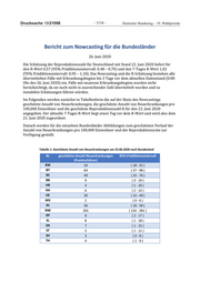 Drucksache 19/21096 ‒ 1116 ‒ Deutscher Bundestag – 19. Wahlperiode Bericht zum Nowcasting für die Bundesländer 26. Juni 2020 Die Schätzung der Reproduktionszahl für Deutschland mit Stand 22. Juni 2020 liefert für den R-Wert 0,57 (95% Prädiktionsintervall: 0,48 – 0,70) und den 7-Tages R-Wert 1,02 (95% Prädiktionsintervall: 0,95 – 1,10). Das Nowcasting und die R-Schätzung beziehen alle übermittelten Fälle mit Erkrankungsbeginn bis 3 Tage vor dem aktuellen Datenstand (0:00 Uhr des 26. Juni 2020) ein. Fälle mit neuerem Erkrankungsbeginn wurden nicht berücksichtigt, da sie noch nicht in ausreichender Zahl übermittelt wurden und zu instabilen Schätzungen führen würden. Im Folgenden werden zunächst in Tabellenform die auf der Basis des Nowcastings geschätzte Anzahl von Neuerkrankungen, die geschätzte Anzahl von Neuerkrankungen pro 100,000 Einwohner und die geschätzte Reproduktionszahl R für den 22. Juni 2020 angegeben. Der aktuelle 7-Tages R-Wert liegt einen Tag vor dem R-Wert und wird also dem 21. Juni 2020 zugeordnet. Danach werden für die einzelnen Bundesländer Abbildungen zum geschätzten Verlauf der Anzahl von Neuerkrankungen pro 100,000 Einwohner und der Reproduktionsrate zur Verfügung gestellt. Tabelle 1: Geschätzte Anzahl von Neuerkrankungen am 22.06.2020 nach Bundesland BL geschätzte Anzahl Neuerkrankungen 95%-Prädiktionsintervall (Punktschätzer) BW 34 ( 18 - 55 ) BY 64 ( 37 - 98 ) BE 49 ( 25 - 76 ) BB 9 ( 3 - 19 ) HB 4 ( 1 - 10 ) HH 6 ( 2 - 13 ) HE 30 ( 14 - 49 ) MV 2 (0-6) NI 36 ( 18 - 58 ) NW 201 ( 132 - 281 ) RP 8 ( 2 - 17 ) SL 8 ( 1 - 18 ) SN 7 ( 1 - 15 ) ST 5 ( 1 - 11 ) SH 3 (0-8) TH 4 (1-9)