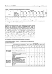 Deutscher Bundestag – 19. Wahlperiode –5– Drucksache 19/19869 Ausgang der beschiedenen Verfahren zu bundesrechtlich geregelten Berufen Ausbildungsstaat: Chile Berichtsjahr Entscheidung (vor Rechtsbehelf) 2012 2013 2014 2015 2016 2017 2018 Positiv – volle Gleichwertigkeit der Aus Datenschutzgründen nicht auflistbar 1) - 6 6 3 3 3 Berufsqualifikation Bescheid mit der „Auflage“ einer Ausgleichsmaßnahme, zum 31.12. des jeweiligen Berichtsjahres noch - - - - - - nicht absolviert (nur reglementierte beschiedene Berufe) 2) Verfahren zu Teilweise Gleichwertigkeit (nur nicht Berufen nach - - 3 3 3 3 reglementierte Berufe) BBiG/HwO** Negativ3) - - - - - - Gesamt - 6 6 9 6 6 6 Quelle: amtliche Statistik 2012-2018 nach § 17 BQFG bzw. Fachrechte mit Verweis auf § 17 BQFG. Erhebung der Statistischen Ämter von Bund und Ländern. Berechnungen des BIBB. * beinhaltet Gesundheitsfachberufe und akademische Heilberufe (alle reglementiert). ** beinhaltet nicht reglementierte Aus- und Fortbildungsberufe nach BBiG und HwO sowie reglemen- tierte Fortbildungsberufe nach HwO (Meisterberufe). 1) Einem Bescheid über die volle Gleichwertigkeit kann bei reglementierten Berufen die erfolgreiche Absolvierung einer Ausgleichsmaßnahme vorangegangen sein. 2) Nach der erfolgreichen Absolvierung der Ausgleichsmaßnahme wird die volle Gleichwertigkeit er- teilt. 3) inkl. Unaufklärbarkeit des Sachverhalts bei nicht reglementierten Berufen. Hinweis: Aus Datenschutzgründen sind alle Daten (Absolutwerte) jeweils auf ein Viel- faches von drei gerundet; der Gesamtwert kann deshalb von der Summe der Einzelwerte abweichen. Für das erste Berichtsjahr 2012 wurden die für die An- erkennung zuständigen Stellen in einigen Fällen erst im Laufe des Berichts- jahres bestimmt und mussten ihre Berichtssysteme neu aufbauen. Daher sind die Meldungen möglicherweise nicht in allen Fällen vollumfänglich und ter- mingerecht erfolgt. Für das Berichtsjahr 2013 erfolgte die Meldung einiger Be- richtsstellen unvollständig und fehlerhaft. Insofern ist das Bundesergebnis als Untergrenze zu betrachten. Für Bremen liegen keine Daten für das Jahr 2015 vor. Daher wurden für dieses Bundesland die Angaben von 2014 übernommen. Für die Bundesländer Hamburg und Schleswig-Holstein liegt für das Berichts- jahr 2016 insgesamt eine Untererfassung in niedriger dreistelliger Höhe im Be- reich der medizinischen Gesundheitsberufe vor. 5. Kann die Bundesregierung diesbezügliche statistische Angaben auch für Anträge auf Zulassung zu Pflegestudiengängen darstellen, deren Ausge- staltung im Rahmen des Hochschulrechts in den Kompetenzbereich der Länder fällt (wenn ja, bitte analog zu Frage 4 aufschlüsseln)? Der Bundesregierung liegen keine Angaben zu Anträgen auf Zulassung zu Stu- diengängen sowie über die Antragsteller vor.
