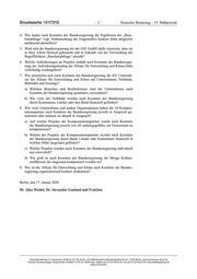 Drucksache 19/17312 –2– Deutscher Bundestag – 19. Wahlperiode 4. Wie lauten nach Kenntnis der Bundesregierung die Ergebnisse der „Base- lineabfrage“ (vgl. Vorbemerkung der Fragesteller) konkret (bitte möglichst umfassend darstellen)? 5. Wird sich die Bundesregierung bei der GIZ GmbH dafür einsetzen, dass sie in ihrer Arbeit Deutsch gebraucht und in Zukunft von der Verwendung der Begrifflichkeit „Baselineabfrage“ absieht? 6. Welche Anforderungen an Projekte enthält nach Kenntnis der Bundesregie- rung der Anforderungskatalog der Allianz für Entwicklung und Klima (bitte vollständig wiedergeben)? 7. Wie unterteilen sich nach Kenntnis der Bundesregierung die 452 Unterstüt- zer der Allianz für Entwicklung und Klima auf Unternehmen, Verbände, Behörden und Sonstige? a) Welchen Branchen und Rechtsformen sind die Unternehmen nach Kenntnis der Bundesregierung quantitativ zuzuordnen? b) Wie viele der Verbände werden nach Kenntnis der Bundesregierung durch Kommunen, Länder oder den Bund finanziell gefördert? 8. Wie viele Unternehmen und andere Organisationen haben die 18 Kompen- sationspartner nach Kenntnis der Bundesregierung jeweils in Anspruch ge- nommen oder nehmen sie aktuell in Anspruch? a) Auf welche Projekte der Kompensationspartner wurde nach Kenntnis der Bundesregierung jeweils wie oft zurückgegriffen, um Emissionen zu kompensieren? b) Welche der Projekte der Kompensationspartner werden nach Kenntnis der Bundesregierung durch Bund, Länder oder Kommunen finanziell in welcher Höhe insgesamt gefördert? c) Welche Projekte wurden nach Kenntnis der Bundesregierung individuell neu entwickelt? d) Wie groß ist nach Kenntnis der Bundesregierung die Menge Kohlen- stoffdioxid, die insgesamt kompensiert worden ist? 9. Wie ist die Allianz für Entwicklung und Klima nach Kenntnis der Bundes- regierung organisatorisch konkret strukturiert? Berlin, den 17. Januar 2020 Dr. Alice Weidel, Dr. Alexander Gauland und Fraktion Gesamtherstellung: H. Heenemann GmbH & Co. KG, Buch- und Offsetdruckerei, Bessemerstraße 83–91, 12103 Berlin, www.heenemann-druck.de Vertrieb: Bundesanzeiger Verlag GmbH, Postfach 10 05 34, 50445 Köln, Telefon (02 21) 97 66 83 40, Fax (02 21) 97 66 83 44, www.betrifft-gesetze.de ISSN 0722-8333