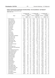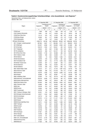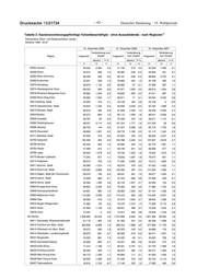 Drucksache 19/21734 – 44 – Deutscher Bundestag – 19. Wahlperiode 1) Tabelle 2: Sozialversicherungspflichtige Vollzeitbeschäftigte - ohne Auszubildende - nach Regionen Deutschland, West- und Ostdeutschland, Länder und Kreise (Arbeitsort) (Gebietsstand des jeweiligen Stichtags) Zeitreihe 1999 - 2019 31. Dezember 2005 31. Dezember 2006 31. Dezember 2007 Veränderung zum Veränderung Veränderung Region Insgesamt Vorjahr Insgesamt zum Vorjahr Insgesamt zum Vorjahr absolut in % absolut in % absolut in % 19 20 21 22 23 24 25 26 27 07336 Kusel 7.646 -350 -4,4 7.508 -138 -1,8 7.725 217 2,9 07337 Südliche Weinstraße 15.651 -104 -0,7 15.876 225 1,4 16.075 199 1,3 07338 Rhein-Pfalz-Kreis 15.113 -270 -1,8 15.700 587 3,9 16.130 430 2,7 07339 Mainz-Bingen 30.392 -531 -1,7 30.866 474 1,6 31.435 569 1,8 07340 Südwestpfalz 9.914 -193 -1,9 10.044 130 1,3 9.937 -107 -1,1 08 Baden-Württemberg 2.830.774 -22.769 -0,8 2.853.623 22.849 0,8 2.906.326 52.703 1,8 08111 Stuttgart, Landeshauptstadt 267.803 -4.637 -1,7 264.026 -3.777 -1,4 266.845 2.819 1,1 08115 Böblingen 123.437 -2.268 -1,8 120.935 -2.502 -2,0 121.828 893 0,7 08116 Esslingen 138.219 -1.953 -1,4 138.441 222 0,2 140.252 1.811 1,3 08117 Göppingen 56.843 -522 -0,9 57.296 453 0,8 58.137 841 1,5 08118 Ludwigsburg 124.018 -928 -0,7 124.747 729 0,6 126.789 2.042 1,6 08119 Rems-Murr-Kreis 92.002 -1.739 -1,9 92.398 396 0,4 93.879 1.481 1,6 08121 Heilbronn, Stadt 43.358 390 0,9 44.269 911 2,1 44.530 261 0,6 08125 Heilbronn 78.260 -15 -0,0 79.625 1.365 1,7 82.046 2.421 3,0 08126 Hohenlohekreis 33.079 -478 -1,4 34.060 981 3,0 35.367 1.307 3,8 08127 Schwäbisch Hall 45.840 691 1,5 47.170 1.330 2,9 48.836 1.666 3,5 08128 Main-Tauber-Kreis 32.529 -367 -1,1 32.887 358 1,1 33.941 1.054 3,2 08135 Heidenheim 33.986 -556 -1,6 34.232 246 0,7 34.557 325 0,9 08136 Ostalbkreis 75.194 -359 -0,5 76.074 880 1,2 77.655 1.581 2,1 08211 Baden-Baden, Stadt 19.413 -411 -2,1 21.410 1.997 10,3 22.155 745 3,5 08212 Karlsruhe, Stadt 110.258 385 0,4 110.155 -103 -0,1 111.041 886 0,8 08215 Karlsruhe 90.370 -1.092 -1,2 92.578 2.208 2,4 94.160 1.582 1,7 08216 Rastatt 62.996 267 0,4 62.991 -5 -0,0 63.339 348 0,6 08221 Heidelberg, Stadt 52.323 110 0,2 52.175 -148 -0,3 52.929 754 1,4 08222 Mannheim, Universitätsstadt 120.318 -2.056 -1,7 120.478 160 0,1 123.084 2.606 2,2 08225 Neckar-Odenwald-Kreis 28.230 -288 -1,0 28.615 385 1,4 29.038 423 1,5 08226 Rhein-Neckar-Kreis 103.452 -948 -0,9 105.506 2.054 2,0 108.397 2.891 2,7 08231 Pforzheim, Stadt 35.695 -623 -1,7 36.023 328 0,9 36.882 859 2,4 08235 Calw 28.190 -213 -0,7 28.422 232 0,8 28.761 339 1,2 08236 Enzkreis 40.655 -152 -0,4 40.998 343 0,8 42.023 1.025 2,5 08237 Freudenstadt 30.732 54 0,2 31.612 880 2,9 32.243 631 2,0 08311 Freiburg im Breisgau, Stadt 65.331 519 0,8 65.903 572 0,9 66.606 703 1,1 08315 Breisgau-Hochschwarzwald 45.917 -1.243 -2,6 46.605 688 1,5 47.392 787 1,7 08316 Emmendingen 29.773 135 0,5 29.993 220 0,7 30.545 552 1,8 08317 Ortenaukreis 110.074 -1.713 -1,5 111.477 1.403 1,3 114.334 2.857 2,6 08325 Rottweil 36.110 -230 -0,6 36.621 511 1,4 37.672 1.051 2,9 08326 Schwarzwald-Baar-Kreis 56.741 -1.300 -2,2 58.007 1.266 2,2 58.903 896 1,5 08327 Tuttlingen 39.917 370 0,9 40.782 865 2,2 42.176 1.394 3,4 08335 Konstanz 58.763 -241 -0,4 58.950 187 0,3 59.126 176 0,3 08336 Lörrach 49.108 -558 -1,1 49.249 141 0,3 49.636 387 0,8 08337 Waldshut 33.749 -194 -0,6 34.268 519 1,5 34.485 217 0,6 08415 Reutlingen 67.921 -449 -0,7 68.785 864 1,3 71.166 2.381 3,5 08416 Tübingen 40.766 -385 -0,9 40.901 135 0,3 41.797 896 2,2 08417 Zollernalbkreis 44.740 -181 -0,4 45.076 336 0,8 45.791 715 1,6 08421 Ulm, Universitätsstadt 57.213 2.120 3,8 58.446 1.233 2,2 60.327 1.881 3,2 08425 Alb-Donau-Kreis 33.086 -1.151 -3,4 33.911 825 2,5 34.967 1.056 3,1 08426 Biberach 47.323 186 0,4 48.760 1.437 3,0 50.619 1.859 3,8