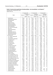 Drucksache 19/21734 – 48 – Deutscher Bundestag – 19. Wahlperiode 1) Tabelle 2: Sozialversicherungspflichtige Vollzeitbeschäftigte - ohne Auszubildende - nach Regionen Deutschland, West- und Ostdeutschland, Länder und Kreise (Arbeitsort) (Gebietsstand des jeweiligen Stichtags) Zeitreihe 1999 - 2019 31. Dezember 2005 31. Dezember 2006 31. Dezember 2007 Veränderung zum Veränderung Veränderung Region Insgesamt Vorjahr Insgesamt zum Vorjahr Insgesamt zum Vorjahr absolut in % absolut in % absolut in % 19 20 21 22 23 24 25 26 27 13053 Güstrow 18.916 -211 -1,1 19.130 214 1,1 19.313 183 1,0 13054 Ludwigslust 24.995 -447 -1,8 26.278 1.283 5,1 26.656 378 1,4 13055 Mecklenburg-Strelitz 11.895 -485 -3,9 11.999 104 0,9 12.089 90 0,8 13056 Müritz 14.200 218 1,6 14.218 18 0,1 14.477 259 1,8 13057 Nordvorpommern 16.082 -595 -3,6 16.551 469 2,9 16.539 -12 -0,1 13058 Nordwestmecklenburg 18.752 124 0,7 19.681 929 5,0 19.649 -32 -0,2 13059 Ostvorpommern 18.454 -315 -1,7 18.629 175 0,9 19.178 549 2,9 13060 Parchim 17.182 -343 -2,0 17.529 347 2,0 17.744 215 1,2 13061 Rügen 13.050 -699 -5,1 13.062 12 0,1 13.610 548 4,2 13062 Uecker-Randow 11.352 -410 -3,5 11.760 408 3,6 12.174 414 3,5 13071 Mecklenburgische Seenplatte - - - - - - - - - 13072 Landkreis Rostock - - - - - - - - - 13073 Vorpommern-Rügen - - - - - - - - - 13074 Nordwestmecklenburg - - - - - - - - - 13075 Vorpommern-Greifswald - - - - - - - - - 13076 Ludwigslust-Parchim - - - - - - - - - 14 Sachsen 967.653 -32.908 -3,3 991.961 24.308 2,5 1.011.917 19.956 2,0 14013 Auerbach - - - - - - - - - 14036 Klingenthal - - - - - - - - - 14042 Oelsnitz - - - - - - - - - 14045 Plauen - - - - - - - - - 14046 Reichenbach - - - - - - - - - 14061 Chemnitz, Stadt - - - - - - - - - 14062 Dresden, Stadt - - - - - - - - - 14063 Görlitz, Stadt - - - - - - - - - 14064 Hoyerswerda - - - - - - - - - 14065 Leipzig, Stadt - - - - - - - - - 14066 Plauen, Stadt - - - - - - - - - 14067 Zwickau, Stadt - - - - - - - - - 14071 Annaberg - - - - - - - - - 14072 Bautzen - - - - - - - - - 14073 Chemnitzer Land - - - - - - - - - 14074 Delitzsch - - - - - - - - - 14075 Döbeln - - - - - - - - - 14077 Freiberg - - - - - - - - - 14078 Name unbekannt - - - - - - - - - 14079 Leipziger Land - - - - - - - - - 14080 Meißen - - - - - - - - - 14081 Mittlerer Erzgebirgskreis - - - - - - - - - 14082 Mittweida - - - - - - - - - 14083 Muldentalkreis - - - - - - - - - 14084 Niederschlesischer Oberlausitz - - - - - - - - - 14085 Riesa-Großenhain - - - - - - - - - 14086 Sächsischer Oberlausitzkreis - - - - - - - - - 14087 Sächsische Schweiz - - - - - - - - - 14088 Stollberg - - - - - - - - - 14089 Torgau-Oschatz - - - - - - - - -