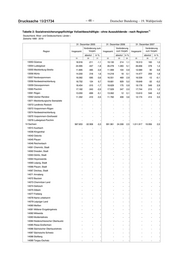 Drucksache 19/21734 – 42 – Deutscher Bundestag – 19. Wahlperiode 1) Tabelle 2: Sozialversicherungspflichtige Vollzeitbeschäftigte - ohne Auszubildende - nach Regionen Deutschland, West- und Ostdeutschland, Länder und Kreise (Arbeitsort) (Gebietsstand des jeweiligen Stichtags) Zeitreihe 1999 - 2019 31. Dezember 2005 31. Dezember 2006 31. Dezember 2007 Veränderung zum Veränderung Veränderung Region Insgesamt Vorjahr Insgesamt zum Vorjahr Insgesamt zum Vorjahr absolut in % absolut in % absolut in % 19 20 21 22 23 24 25 26 27 05354 Aachen 50.932 -2.284 -4,3 51.150 218 0,4 52.249 1.099 2,1 05358 Düren 50.912 -636 -1,2 50.664 -248 -0,5 50.995 331 0,7 05362 Rhein-Erft-Kreis 86.399 -426 -0,5 86.161 -238 -0,3 88.864 2.703 3,1 05366 Euskirchen 33.221 -348 -1,0 33.663 442 1,3 34.158 495 1,5 05370 Heinsberg 36.919 -1.133 -3,0 36.892 -27 -0,1 37.289 397 1,1 05374 Oberbergischer Kreis 66.545 -394 -0,6 67.871 1.326 2,0 69.815 1.944 2,9 05378 Rheinisch-Bergischer Kreis 46.825 -1.040 -2,2 46.620 -205 -0,4 47.317 697 1,5 05382 Rhein-Sieg-Kreis 90.682 -1.554 -1,7 90.611 -71 -0,1 94.034 3.423 3,8 05512 Bottrop, Stadt 22.955 474 2,1 23.139 184 0,8 23.136 -3 -0,0 05513 Gelsenkirchen, Stadt 53.844 -1.330 -2,4 50.495 -3.349 -6,2 52.184 1.689 3,3 05515 Münster, Stadt 90.610 452 0,5 91.839 1.229 1,4 94.339 2.500 2,7 05554 Borken 83.573 -884 -1,0 85.112 1.539 1,8 88.041 2.929 3,4 05558 Coesfeld 36.767 -94 -0,3 37.339 572 1,6 38.511 1.172 3,1 05562 Recklinghausen 99.537 -3.114 -3,0 101.314 1.777 1,8 101.353 39 0,0 05566 Steinfurt 88.723 144 0,2 91.021 2.298 2,6 92.773 1.752 1,9 05570 Warendorf 58.608 -1.321 -2,2 59.770 1.162 2,0 61.112 1.342 2,2 05711 Bielefeld, Stadt 87.620 -419 -0,5 87.853 233 0,3 89.900 2.047 2,3 05754 Gütersloh 102.362 -353 -0,3 104.788 2.426 2,4 107.607 2.819 2,7 05758 Herford 62.045 -952 -1,5 62.685 640 1,0 63.776 1.091 1,7 05762 Höxter 27.468 -313 -1,1 28.109 641 2,3 28.386 277 1,0 05766 Lippe 69.505 -1.578 -2,2 70.730 1.225 1,8 72.642 1.912 2,7 05770 Minden-Lübbecke 77.245 -877 -1,1 78.642 1.397 1,8 79.473 831 1,1 05774 Paderborn 69.513 -722 -1,0 71.606 2.093 3,0 73.212 1.606 2,2 05911 Bochum, Stadt 92.096 -1.274 -1,4 92.575 479 0,5 91.523 -1.052 -1,1 05913 Dortmund, Stadt 139.555 -3.968 -2,8 140.052 497 0,4 141.632 1.580 1,1 05914 Hagen, Stadt der FernUniversi. 48.070 -190 -0,4 48.531 461 1,0 49.571 1.040 2,1 05915 Hamm, Stadt 37.699 -800 -2,1 37.410 -289 -0,8 37.669 259 0,7 05916 Herne, Stadt 32.586 1.480 4,8 34.123 1.537 4,7 34.226 103 0,3 05954 Ennepe-Ruhr-Kreis 69.824 -2.323 -3,2 70.263 439 0,6 71.966 1.703 2,4 05958 Hochsauerlandkreis 64.661 -965 -1,5 65.983 1.322 2,0 67.191 1.208 1,8 05962 Märkischer Kreis 113.492 -2.539 -2,2 114.415 923 0,8 116.462 2.047 1,8 05966 Olpe 36.569 -476 -1,3 37.574 1.005 2,7 38.842 1.268 3,4 05970 Siegen-Wittgenstein 74.460 145 0,2 75.470 1.010 1,4 77.585 2.115 2,8 05974 Soest 67.959 -1.132 -1,6 68.457 498 0,7 70.333 1.876 2,7 05978 Unna 73.297 -3 -0,0 73.917 620 0,8 75.835 1.918 2,6 06 Hessen 1.566.685 -25.225 -1,6 1.572.990 6.305 0,4 1.601.280 28.290 1,8 06411 Darmstadt, Wissenschaftsstadt 61.119 -922 -1,5 61.350 231 0,4 62.358 1.008 1,6 06412 Frankfurt am Main, Stadt 364.826 -6.958 -1,9 366.514 1.688 0,5 377.669 11.155 3,0 06413 Offenbach am Main, Stadt 33.072 -595 -1,8 32.970 -102 -0,3 33.686 716 2,2 06414 Wiesbaden, Landeshauptstadt 89.579 -661 -0,7 89.360 -219 -0,2 90.417 1.057 1,2 06431 Bergstraße 44.550 -881 -1,9 44.525 -25 -0,1 45.323 798 1,8 06432 Darmstadt-Dieburg 43.959 -963 -2,1 44.241 282 0,6 44.454 213 0,5 06433 Groß-Gerau 71.212 -1.196 -1,7 69.021 -2.191 -3,1 67.753 -1.268 -1,8 06434 Hochtaunuskreis 58.290 630 1,1 58.872 582 1,0 60.277 1.405 2,4 06435 Main-Kinzig-Kreis 80.773 -1.393 -1,7 80.884 111 0,1 81.920 1.036 1,3 06436 Main-Taunus-Kreis 60.522 -1.228 -2,0 61.040 518 0,9 63.153 2.113 3,5 06437 Odenwaldkreis 16.915 -1.216 -6,7 17.140 225 1,3 17.580 440 2,6