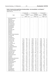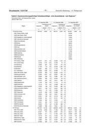 Deutscher Bundestag – 19. Wahlperiode – 49 – Drucksache 19/21734 1) Tabelle 2: Sozialversicherungspflichtige Vollzeitbeschäftigte - ohne Auszubildende - nach Regionen Deutschland, West- und Ostdeutschland, Länder und Kreise (Arbeitsort) (Gebietsstand des jeweiligen Stichtags) Zeitreihe 1999 - 2019 31. Dezember 2005 31. Dezember 2006 31. Dezember 2007 Veränderung zum Veränderung Veränderung Region Insgesamt Vorjahr Insgesamt zum Vorjahr Insgesamt zum Vorjahr absolut in % absolut in % absolut in % 19 20 21 22 23 24 25 26 27 14091 Westerzgebirgskreis - - - - - - - - - 14092 Kamenz - - - - - - - - - 14093 Zwickauer Land - - - - - - - - - 14094 Dresden-Land - - - - - - - - - 14095 Hoyerswerda - - - - - - - - - 14511 Chemnitz, Stadt - - - - - - - - - 14521 Erzgebirgskreis - - - - - - - - - 14522 Mittelsachsen - - - - - - - - - 14523 Vogtlandkreis - - - - - - - - - 14524 Zwickau - - - - - - - - - 14612 Dresden, Stadt - - - - - - - - - 14625 Bautzen - - - - - - - - - 14626 Görlitz - - - - - - - - - 14627 Meißen - - - - - - - - - 14628 Sächs. Schweiz-Osterzgebirge - - - - - - - - - 14713 Leipzig, Stadt - - - - - - - - - 14729 Leipzig - - - - - - - - - 14730 Nordsachsen - - - - - - - - - 14161 Chemnitz, Stadt 72.717 -3.084 -4,1 74.454 1.737 2,4 75.561 1.107 1,5 14166 Plauen, Stadt 17.436 -525 -2,9 17.263 -173 -1,0 17.322 59 0,3 14167 Zwickau, Stadt 34.175 -517 -1,5 34.670 495 1,4 35.000 330 1,0 14171 Annaberg 17.985 -594 -3,2 18.424 439 2,4 18.490 66 0,4 14173 Chemnitzer Land 28.042 -803 -2,8 28.608 566 2,0 29.035 427 1,5 14177 Freiberg 30.894 -801 -2,5 31.704 810 2,6 32.920 1.216 3,8 14178 Vogtlandkreis 37.253 -886 -2,3 38.037 784 2,1 38.999 962 2,5 14181 Mittlerer Erzgebirgskreis 16.584 -956 -5,5 16.777 193 1,2 16.728 -49 -0,3 14182 Mittweida 25.987 -751 -2,8 26.673 686 2,6 26.764 91 0,3 14188 Stollberg 16.089 -327 -2,0 16.535 446 2,8 17.051 516 3,1 14191 Aue-Schwarzenberg 25.230 -1.071 -4,1 25.578 348 1,4 25.487 -91 -0,4 14193 Zwickauer Land 19.373 -714 -3,6 19.528 155 0,8 19.982 454 2,3 14262 Dresden, Stadt 154.261 -1.259 -0,8 158.088 3.827 2,5 162.261 4.173 2,6 14263 Görlitz, Stadt 10.989 -286 -2,5 11.061 72 0,7 11.388 327 3,0 14264 Hoyerswerda, Stadt 7.421 -718 -8,8 6.895 -526 -7,1 6.922 27 0,4 14272 Bautzen 32.612 -1.087 -3,2 33.906 1.294 4,0 34.525 619 1,8 14280 Meißen 33.957 -1.299 -3,7 34.410 453 1,3 35.812 1.402 4,1 14284 Niederschles. Oberlausitzkreis 14.765 -1.243 -7,8 14.649 -116 -0,8 15.088 439 3,0 14285 Riesa-Großenhain 24.245 -1.786 -6,9 24.764 519 2,1 24.703 -61 -0,2 14286 Löbau-Zittau 23.426 -1.313 -5,3 24.440 1.014 4,3 24.570 130 0,5 14287 Sächsische Schweiz 24.103 -2.478 -9,3 24.589 486 2,0 25.120 531 2,2 14290 Weißeritzkreis 23.657 -832 -3,4 24.073 416 1,8 24.838 765 3,2 14292 Kamenz 31.747 -1.201 -3,6 32.471 724 2,3 32.386 -85 -0,3 14365 Leipzig, Stadt 138.333 -2.477 -1,8 144.622 6.289 4,5 148.886 4.264 2,9 14374 Delitzsch 24.865 -1.580 -6,0 25.489 624 2,5 27.308 1.819 7,1 14375 Döbeln 15.000 -733 -4,7 15.289 289 1,9 15.586 297 1,9 14379 Leipziger Land 25.403 -1.277 -4,8 26.109 706 2,8 26.424 315 1,2 14383 Muldentalkreis 22.866 -1.239 -5,1 24.103 1.237 5,4 23.926 -177 -0,7 14389 Torgau-Oschatz 18.238 -1.071 -5,5 18.752 514 2,8 18.835 83 0,4