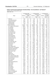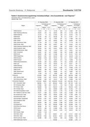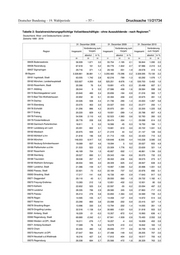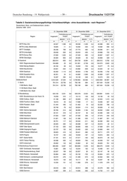 Drucksache 19/21734 – 56 – Deutscher Bundestag – 19. Wahlperiode 1) Tabelle 2: Sozialversicherungspflichtige Vollzeitbeschäftigte - ohne Auszubildende - nach Regionen Deutschland, West- und Ostdeutschland, Länder und Kreise (Arbeitsort) (Gebietsstand des jeweiligen Stichtags) Zeitreihe 1999 - 2019 31. Dezember 2008 31. Dezember 2009 31. Dezember 2010 Veränderung zum Veränderung zum Veränderung Region Insgesamt Vorjahr Insgesamt Vorjahr Insgesamt zum Vorjahr absolut in % absolut in % absolut in % 28 29 30 31 32 33 34 35 36 07336 Kusel 7.881 156 2,0 7.730 -151 -1,9 7.785 55 0,7 07337 Südliche Weinstraße 16.327 252 1,6 16.075 -252 -1,5 16.439 364 2,3 07338 Rhein-Pfalz-Kreis 16.565 435 2,7 16.365 -200 -1,2 17.109 744 4,5 07339 Mainz-Bingen 31.773 338 1,1 31.501 -272 -0,9 31.876 375 1,2 07340 Südwestpfalz 9.765 -172 -1,7 9.568 -197 -2,0 9.636 68 0,7 08 Baden-Württemberg 2.924.401 18.075 0,6 2.838.640 -85.761 -2,9 2.899.219 60.579 2,1 08111 Stuttgart, Landeshauptstadt 268.381 1.536 0,6 259.213 -9.168 -3,4 261.052 1.839 0,7 08115 Böblingen 122.195 367 0,3 119.642 -2.553 -2,1 121.444 1.802 1,5 08116 Esslingen 140.866 614 0,4 136.005 -4.861 -3,5 136.179 174 0,1 08117 Göppingen 58.023 -114 -0,2 55.936 -2.087 -3,6 56.958 1.022 1,8 08118 Ludwigsburg 128.449 1.660 1,3 123.223 -5.226 -4,1 125.186 1.963 1,6 08119 Rems-Murr-Kreis 94.160 281 0,3 90.699 -3.461 -3,7 92.307 1.608 1,8 08121 Heilbronn, Stadt 44.219 -311 -0,7 43.164 -1.055 -2,4 44.532 1.368 3,2 08125 Heilbronn 84.335 2.289 2,8 83.022 -1.313 -1,6 85.660 2.638 3,2 08126 Hohenlohekreis 36.150 783 2,2 35.164 -986 -2,7 36.817 1.653 4,7 08127 Schwäbisch Hall 48.419 -417 -0,9 48.147 -272 -0,6 50.336 2.189 4,5 08128 Main-Tauber-Kreis 34.285 344 1,0 33.373 -912 -2,7 34.518 1.145 3,4 08135 Heidenheim 34.987 430 1,2 33.980 -1.007 -2,9 34.356 376 1,1 08136 Ostalbkreis 78.972 1.317 1,7 76.003 -2.969 -3,8 78.820 2.817 3,7 08211 Baden-Baden, Stadt 22.662 507 2,3 21.873 -789 -3,5 22.364 491 2,2 08212 Karlsruhe, Stadt 111.060 19 0,0 109.851 -1.209 -1,1 113.210 3.359 3,1 08215 Karlsruhe 94.639 479 0,5 91.793 -2.846 -3,0 93.706 1.913 2,1 08216 Rastatt 62.037 -1.302 -2,1 60.062 -1.975 -3,2 62.012 1.950 3,2 08221 Heidelberg, Stadt 53.372 443 0,8 53.259 -113 -0,2 54.576 1.317 2,5 08222 Mannheim, Universitätsstadt 125.815 2.731 2,2 123.046 -2.769 -2,2 124.514 1.468 1,2 08225 Neckar-Odenwald-Kreis 28.984 -54 -0,2 28.544 -440 -1,5 28.666 122 0,4 08226 Rhein-Neckar-Kreis 110.728 2.331 2,2 106.473 -4.255 -3,8 106.542 69 0,1 08231 Pforzheim, Stadt 36.783 -99 -0,3 35.462 -1.321 -3,6 36.446 984 2,8 08235 Calw 28.908 147 0,5 28.288 -620 -2,1 29.021 733 2,6 08236 Enzkreis 41.842 -181 -0,4 38.817 -3.025 -7,2 40.142 1.325 3,4 08237 Freudenstadt 32.230 -13 -0,0 30.913 -1.317 -4,1 31.719 806 2,6 08311 Freiburg im Breisgau, Stadt 67.561 955 1,4 67.132 -429 -0,6 68.681 1.549 2,3 08315 Breisgau-Hochschwarzwald 48.316 924 1,9 47.980 -336 -0,7 49.592 1.612 3,4 08316 Emmendingen 31.127 582 1,9 30.211 -916 -2,9 31.145 934 3,1 08317 Ortenaukreis 113.878 -456 -0,4 110.452 -3.426 -3,0 113.348 2.896 2,6 08325 Rottweil 37.494 -178 -0,5 35.913 -1.581 -4,2 37.367 1.454 4,0 08326 Schwarzwald-Baar-Kreis 57.751 -1.152 -2,0 55.314 -2.437 -4,2 57.469 2.155 3,9 08327 Tuttlingen 42.548 372 0,9 40.479 -2.069 -4,9 42.202 1.723 4,3 08335 Konstanz 59.096 -30 -0,1 57.603 -1.493 -2,5 59.057 1.454 2,5 08336 Lörrach 49.463 -173 -0,3 47.749 -1.714 -3,5 48.291 542 1,1 08337 Waldshut 34.197 -288 -0,8 32.817 -1.380 -4,0 33.626 809 2,5 08415 Reutlingen 71.041 -125 -0,2 68.145 -2.896 -4,1 69.318 1.173 1,7 08416 Tübingen 42.247 450 1,1 41.649 -598 -1,4 42.127 478 1,1 08417 Zollernalbkreis 45.618 -173 -0,4 43.451 -2.167 -4,8 44.254 803 1,8 08421 Ulm, Universitätsstadt 59.771 -556 -0,9 57.852 -1.919 -3,2 60.679 2.827 4,9 08425 Alb-Donau-Kreis 36.203 1.236 3,5 35.135 -1.068 -3,0 35.744 609 1,7 08426 Biberach 51.316 697 1,4 50.111 -1.205 -2,3 50.828 717 1,4