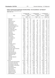 Deutscher Bundestag – 19. Wahlperiode – 57 – Drucksache 19/21734 1) Tabelle 2: Sozialversicherungspflichtige Vollzeitbeschäftigte - ohne Auszubildende - nach Regionen Deutschland, West- und Ostdeutschland, Länder und Kreise (Arbeitsort) (Gebietsstand des jeweiligen Stichtags) Zeitreihe 1999 - 2019 31. Dezember 2008 31. Dezember 2009 31. Dezember 2010 Veränderung zum Veränderung zum Veränderung Region Insgesamt Vorjahr Insgesamt Vorjahr Insgesamt zum Vorjahr absolut in % absolut in % absolut in % 28 29 30 31 32 33 34 35 36 08435 Bodenseekreis 56.939 1.671 3,0 55.754 -1.185 -2,1 56.844 1.090 2,0 08436 Ravensburg 67.618 161 0,2 65.776 -1.842 -2,7 67.986 2.210 3,4 08437 Sigmaringen 29.716 371 1,3 29.165 -551 -1,9 29.578 413 1,4 09 Bayern 3.328.861 36.881 1,1 3.255.465 -73.396 -2,2 3.328.595 73.130 2,2 09161 Ingolstadt, Stadt 63.005 1.742 2,8 62.216 -789 -1,3 63.292 1.076 1,7 09162 München, Landeshauptstadt 533.927 4.200 0,8 525.251 -8.676 -1,6 530.703 5.452 1,0 09163 Rosenheim, Stadt 20.366 76 0,4 19.891 -475 -2,3 20.498 607 3,1 09171 Altötting 28.044 9 0,0 27.586 -458 -1,6 28.584 998 3,6 09172 Berchtesgadener Land 20.840 480 2,4 20.656 -184 -0,9 21.016 360 1,7 09173 Bad Tölz-Wolfratshausen 22.852 30 0,1 22.394 -458 -2,0 22.675 281 1,3 09174 Dachau 22.026 508 2,4 21.736 -290 -1,3 23.003 1.267 5,8 09175 Ebersberg 23.570 463 2,0 23.027 -543 -2,3 23.277 250 1,1 09176 Eichstätt 21.256 886 4,3 20.975 -281 -1,3 22.200 1.225 5,8 09177 Erding 20.220 829 4,3 19.931 -289 -1,4 20.788 857 4,3 09178 Freising 54.506 2.110 4,0 52.523 -1.983 -3,6 52.783 260 0,5 09179 Fürstenfeldbruck 28.778 228 0,8 28.474 -304 -1,1 29.088 614 2,2 09180 Garmisch-Partenkirchen 16.611 5 0,0 16.566 -45 -0,3 16.750 184 1,1 09181 Landsberg am Lech 20.291 602 3,1 19.681 -610 -3,0 20.722 1.041 5,3 09182 Miesbach 20.975 559 2,7 21.019 44 0,2 21.147 128 0,6 09183 Mühldorf a.Inn 21.818 196 0,9 21.713 -105 -0,5 22.423 710 3,3 09184 München 146.003 6.917 5,0 139.648 -6.355 -4,4 143.228 3.580 2,6 09185 Neuburg-Schrobenhausen 19.089 837 4,6 19.094 5 0,0 20.027 933 4,9 09186 Pfaffenhofen a.d.Ilm 21.533 523 2,5 23.309 1.776 8,2 23.630 321 1,4 09187 Rosenheim 46.169 704 1,5 45.667 -502 -1,1 46.861 1.194 2,6 09188 Starnberg 29.527 890 3,1 29.343 -184 -0,6 30.075 732 2,5 09189 Traunstein 39.538 257 0,7 39.302 -236 -0,6 39.575 273 0,7 09190 Weilheim-Schongau 28.934 555 2,0 28.309 -625 -2,2 28.947 638 2,3 09261 Landshut, Stadt 21.086 -159 -0,7 19.997 -1.089 -5,2 20.998 1.001 5,0 09262 Passau, Stadt 22.921 -73 -0,3 22.184 -737 -3,2 22.876 692 3,1 09263 Straubing, Stadt 17.217 -141 -0,8 16.726 -491 -2,9 17.643 917 5,5 09271 Deggendorf 29.110 43 0,1 28.550 -560 -1,9 29.732 1.182 4,1 09272 Freyung-Grafenau 13.283 212 1,6 12.851 -432 -3,3 12.931 80 0,6 09273 Kelheim 22.652 525 2,4 22.597 -55 -0,2 23.094 497 2,2 09274 Landshut 28.335 796 2,9 28.580 245 0,9 27.863 -717 -2,5 09275 Passau 35.214 278 0,8 33.850 -1.364 -3,9 34.589 739 2,2 09276 Regen 14.595 -105 -0,7 14.458 -137 -0,9 14.972 514 3,6 09277 Rottal-Inn 23.290 850 3,8 23.088 -202 -0,9 23.415 327 1,4 09278 Straubing-Bogen 13.996 330 2,4 13.794 -202 -1,4 14.055 261 1,9 09279 Dingolfing-Landau 32.516 -1.138 -3,4 30.885 -1.631 -5,0 31.818 933 3,0 09361 Amberg, Stadt 16.229 -51 -0,3 15.357 -872 -5,4 15.993 636 4,1 09362 Regensburg, Stadt 69.880 -2.242 -3,1 67.941 -1.939 -2,8 70.493 2.552 3,8 09363 Weiden i.d.OPf., Stadt 16.211 -276 -1,7 16.207 -4 -0,0 16.659 452 2,8 09371 Amberg-Sulzbach 17.089 76 0,4 16.679 -410 -2,4 16.842 163 1,0 09372 Cham 30.433 480 1,6 29.656 -777 -2,6 30.759 1.103 3,7 09373 Neumarkt i.d.OPf. 27.647 564 2,1 27.498 -149 -0,5 28.205 707 2,6 09374 Neustadt a.d.Waldnaab 18.216 427 2,4 17.812 -404 -2,2 18.517 705 4,0 09375 Regensburg 26.038 684 2,7 25.566 -472 -1,8 26.329 763 3,0