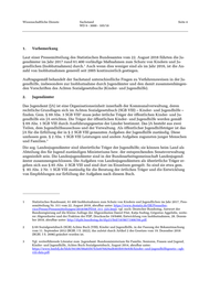 Wissenschaftliche Dienste Sachstand Seite 4 WD 9 - 3000 - 105/18 1. Vorbemerkung Laut einer Pressemitteilung des Statistischen Bundesamtes vom 22. August 2018 führten die Ju- gendämter im Jahr 2017 rund 61.400 vorläufige Maßnahmen zum Schutz von Kindern und Ju- 1 gendlichen (Inobhutnahmen) durch. Auch wenn dies weniger sind als im Jahr 2016, ist die An- zahl von Inobhutnahmen generell seit 2005 kontinuierlich gestiegen. Auftragsgemäß behandelt der Sachstand unterschiedliche Fragen zu Verfahrensweisen in der Ju- gendhilfe, insbesondere zur Inobhutnahme durch Jugendämter und den damit zusammenhängen- den Vorschriften des Achten Sozialgesetzbuchs (Kinder- und Jugendhilfe). 2. Jugendämter Das Jugendamt (JA) ist eine Organisationseinheit innerhalb der Kommunalverwaltung, deren rechtliche Grundlagen sich im Achten Sozialgesetzbuch (SGB VIII) – Kinder- und Jugendhilfe – 2 finden. Gem. § 69 Abs. 3 SGB VIII muss jeder örtliche Träger der öffentlichen Kinder- und Ju- gendhilfe ein JA errichten. Die Träger der öffentlichen Kinder- und Jugendhilfe werden gemäß § 69 Abs. 1 SGB VIII durch Ausführungsgesetze der Länder bestimmt. Das JA besteht aus zwei Teilen, dem Jugendhilfeausschuss und der Verwaltung. Als öffentlicher Jugendhilfeträger ist das JA für die Erfüllung der in § 2 SGB VIII genannten Aufgaben der Jugendhilfe zuständig. Diese umfassen gem. § 2 Abs. 1 SGB VIII Leistungen und andere Aufgaben zugunsten junger Menschen 3 und Familien. Die sog. Landesjugendämter sind überörtliche Träger der Jugendhilfe; sie können beim Land als Abteilung des für Jugend zuständigen Ministeriums bzw. der entsprechenden Senatsverwaltung angesiedelt sein. Die Landesjugendämter sind in der Bundesarbeitsgemeinschaft Landesjugend- ämter zusammengeschlossen. Die Aufgaben von Landesjugendämtern als überörtliche Träger er- geben sich aus § 85 Abs. 2 SGB VIII und sind dort im Einzelnen geregelt. So sind sie etwa gem. § 85 Abs. 2 Nr. 1 SGB VIII zuständig für die Beratung der örtlichen Träger und die Entwicklung von Empfehlungen zur Erfüllung der Aufgaben nach diesem Buch. 1 Statistisches Bundesamt, 61 400 Inobhutnahmen zum Schutz von Kindern und Jugendlichen im Jahr 2017, Pres- semitteilung Nr. 311 vom 22. August 2018, abrufbar unter: https://www.destatis.de/DE/PresseSer- vice/Presse/Pressemitteilungen/2018/08/PD18_311_225.html; vgl. auch: Deutscher Bundestag, Antwort der Bundesregierung auf die Kleine Anfrage der Abgeordneten Daniel Föst, Katja Suding, Grigorios Aggelidis, weite- rer Abgeordneter und der Fraktion der FDP, Drucksache 19/6460, Entwicklung von Inobhutnahmen, 28. Dezem- ber 2018, abrufbar unter: http://dipbt.bundestag.de/dip21/btd/19/067/1906784.pdf. 2 § 69 Sozialgesetzbuch (SGB) Achtes Buch (VIII), Kinder und Jugendhilfe, in der Fassung der Bekanntmachung vom 11. September 2012 (BGBl. I S. 2022), das zuletzt durch Artikel 2 des Gesetzes vom 19. Dezember 2018 (BGBl. I S. 2696) geändert worden ist. 3 Vgl. weiterführende Literatur zum Jugendamt: Bundesministerium für Familie, Senioren, Frauen und Jugend, Kinder- und Jugendhilfe, Achtes Buch Sozialgesetzbuch, August 2014, abrufbar unter: https://www.bmfsfj.de/blob/94106/00a03f47fcbe076829ad6403b919e93b/kinder--und-jugendhilfegesetz---sgb- viii-data.pdf.