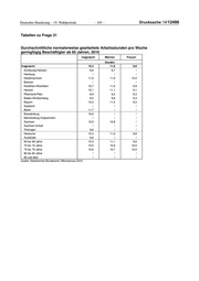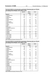 Deutscher Bundestag – 19. Wahlperiode – 105 – Drucksache 19/12486 Durchschnittliche normalerweise gearbeitete Arbeitsstunden pro Woche geringfügig Beschäftigter ab 65 Jahren, 2017 Insgesamt Männer Frauen Stunden Insgesamt 10,0 10,5 9,5 Schleswig-Holstein 9,6 10,3 8,5 Hamburg 13,4 / / Niedersachsen 10,0 10,6 9,4 Bremen / / / Nordrhein-Westfalen 10,1 10,6 9,5 Hessen 10,6 10,8 10,4 Rheinland-Pfalz 10,4 10,9 9,7 Baden-Württemberg 9,4 9,7 9,0 Bayern 9,3 9,7 9,0 Saarland 9,7 / / Berlin 11,0 12,6 9,0 Brandenburg 11,0 11,9 / Mecklenburg-Vorpommern 11,1 / / Sachsen 10,5 10,7 10,3 Sachsen-Anhalt 11,3 12,5 / Thüringen 10,2 10,6 / Deutsche 10,0 10,4 9,4 Ausländer 10,7 11,3 9,9 65 bis 69 Jahre 10,1 10,6 9,5 70 bis 74 Jahre 9,8 10,3 9,2 75 bis 79 Jahre 9,8 9,8 9,7 80 bis 84 Jahre 9,4 10,1 / 85 und älter / / / Quelle: Statistisches Bundesamt, Mikrozensus 2017 Durchschnittliche normalerweise gearbeitete Arbeitsstunden pro Woche geringfügig Beschäftigter ab 65 Jahren, 2018 Insgesamt Männer Frauen Stunden Insgesamt 9,7 10,2 9,1 Schleswig-Holstein 9,3 10,0 8,2 Hamburg 12,2 / / Niedersachsen 9,3 9,8 8,8 Bremen 9,7 / / Nordrhein-Westfalen 10,0 10,6 9,4 Hessen 9,6 10,2 9,0 Rheinland-Pfalz 9,7 10,3 8,9 Baden-Württemberg 9,0 9,4 8,6 Bayern 9,5 9,9 9,1 Saarland 9,9 / / Berlin 11,3 12,7 9,7 Brandenburg 10,2 10,8 9,5 Mecklenburg-Vorpommern 10,9 11,5 / Sachsen 10,1 10,5 9,6 Sachsen-Anhalt 11,4 12,2 / Thüringen 9,4 10,1 / Deutsche 9,7 10,2 9,1 Ausländer 10,1 10,7 9,3 65 bis 69 Jahre 9,7 10,3 9,0 70 bis 74 Jahre 9,6 9,9 9,2 75 bis 79 Jahre 10,0 10,5 9,4 80 bis 84 Jahre 9,8 10,2 9,4 85 und älter / / / Quelle: Statistisches Bundesamt, Mikrozensus 2018