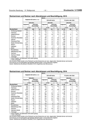 Deutscher Bundestag – 19. Wahlperiode – 61 – Drucksache 19/12486 Rentnerinnen und Rentner nach Altersklassen und Beschäftigung, 2015 davon: Insgesamt (65 Jahre u. ä.) 65 bis 69 Jahre 70 Jahre oder älter darunter: darunter: darunter: Insgesamt abhängig Insgesamt abhängig Insgesamt abhängig Beschäftigte Beschäftigte Beschäftigte in Tsd. % in Tsd. % in Tsd. % Deutschland 15.467 500 3,2 3.734 311 8,3 11.733 189 1,6 Schleswig-Holstein 570 19 3,3 140 11 8,2 431 7 1,7 Hamburg 295 8 2,7 72 5 7,2 223 / / Niedersachsen 1.492 51 3,5 373 34 9,1 1.119 17 1,6 Bremen 124 / / 33 / / 91 / / Nordrhein-Westfalen 3.240 87 2,7 789 54 6,8 2.451 34 1,4 Hessen 1.079 38 3,5 275 22 8,2 804 15 1,9 Rheinland-Pfalz 719 25 3,5 171 15 8,7 548 10 1,9 Baden-Württemberg 1.917 95 4,9 462 56 12,0 1.455 39 2,7 Bayern 2.283 85 3,7 590 52 8,7 1.693 34 2,0 Saarland 179 6 3,6 47 / / 132 / / Berlin 607 15 2,4 139 10 7,0 468 / / Brandenburg 550 12 2,2 119 8 6,5 432 / / Mecklenburg-Vorp. 368 8 2,1 77 6 7,2 291 / / Sachsen 988 22 2,2 206 14 7,0 782 8 1,0 Sachsen-Anhalt 545 10 1,8 121 7 6,0 424 / / Thüringen 511 15 3,0 120 11 9,3 391 / / / = Keine Angabe, da Zahlenwert nicht sicher genug - = nichts vorhanden. Die einzelnen Werte werden ohne Rücksicht auf die Endsumme auf- bzw. abgerundet. Deshalb können sich bei der Summierung von Einzelangaben geringfügige Abweichungen in der Endsumme ergeben. Quelle: Statistisches Bundesamt (Destatis), 2019, Ergebnisse des Mikrozensus. Rentnerinnen und Rentner nach Altersklassen und Beschäftigung, 2016 davon: Insgesamt (65 Jahre u. ä.) 65 bis 69 Jahre 70 Jahre oder älter darunter: darunter: darunter: Insgesamt abhängig Insgesamt abhängig Insgesamt abhängig Beschäftigte Beschäftigte Beschäftigte in Tsd. % in Tsd. % in Tsd. % Deutschland 15.105 533 3,5 3.923 347 8,8 11.181 186 1,7 Schleswig-Holstein 560 19 3,4 141 12 8,2 418 7 1,8 Hamburg 288 8 2,8 78 / / 210 / / Niedersachsen 1.454 49 3,4 376 33 8,8 1.078 16 1,5 Bremen 120 6 4,7 28 / / 92 / / Nordrhein-Westfalen 3.101 92 3,0 821 64 7,7 2.280 29 1,3 Hessen 1.065 44 4,1 289 28 9,6 776 16 2,1 Rheinland-Pfalz 713 31 4,3 202 20 9,9 511 11 2,1 Baden-Württemberg 1.888 100 5,3 476 62 13,0 1.412 38 2,7 Bayern 2.210 94 4,2 613 60 9,8 1.597 34 2,1 Saarland 176 5 3,0 49 / / 127 / / Berlin 591 13 2,2 145 8 5,4 447 5 1,2 Brandenburg 543 13 2,4 126 9 7,1 418 / / Mecklenburg-Vorp. 360 8 2,2 87 5 6,2 272 / / Sachsen 990 29 2,9 235 20 8,7 756 9 1,1 Sachsen-Anhalt 536 9 1,8 130 6 4,8 407 / / Thüringen 510 11 2,3 129 9 6,9 381 / / / = Keine Angabe, da Zahlenwert nicht sicher genug - = nichts vorhanden. Die einzelnen Werte werden ohne Rücksicht auf die Endsumme auf- bzw. abgerundet. Deshalb können sich bei der Summierung von Einzelangaben geringfügige Abweichungen in der Endsumme ergeben. Quelle: Statistisches Bundesamt (Destatis), 2019, Ergebnisse des Mikrozensus.