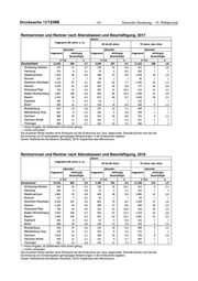 Drucksache 19/12486 – 62 – Deutscher Bundestag – 19. Wahlperiode Rentnerinnen und Rentner nach Altersklassen und Beschäftigung, 2017 davon: Insgesamt (65 Jahre u. ä.) 65 bis 69 Jahre 70 Jahre oder älter darunter: darunter: darunter: Insgesamt abhängig Insgesamt abhängig Insgesamt abhängig Beschäftigte Beschäftigte Beschäftigte in Tsd. % in Tsd. % in Tsd. % Deutschland 15.202 566 3,7 4.049 367 9,1 11.153 198 1,8 Schleswig-Holstein 572 21 3,7 150 14 9,4 421 7 1,6 Hamburg 275 8 3,1 73 6 8,3 202 / / Niedersachsen 1.450 58 4,0 380 37 9,9 1.070 20 1,9 Bremen 125 / / 30 / / 95 / / Nordrhein-Westfalen 3.126 97 3,1 835 64 7,7 2.290 33 1,4 Hessen 1.070 42 3,9 293 26 9,0 777 16 2,0 Rheinland-Pfalz 720 32 4,5 207 21 10,3 512 11 2,2 Baden-Württemberg 1.891 109 5,8 493 68 13,8 1.399 41 3,0 Bayern 2.243 94 4,2 617 60 9,7 1.626 34 2,1 Saarland 185 6 3,3 53 / / 132 / / Berlin 599 16 2,7 150 10 6,9 449 6 1,3 Brandenburg 547 14 2,6 137 10 7,1 409 / / Mecklenburg-Vorp. 361 9 2,5 102 6 5,8 259 / / Sachsen 988 29 3,0 254 20 8,0 734 9 1,2 Sachsen-Anhalt 553 11 2,0 141 7 5,3 411 / / Thüringen 498 13 2,7 132 10 7,3 366 / / / = Keine Angabe, da Zahlenwert nicht sicher genug - = nichts vorhanden. Die einzelnen Werte werden ohne Rücksicht auf die Endsumme auf- bzw. abgerundet. Deshalb können sich bei der Summierung von Einzelangaben geringfügige Abweichungen in der Endsumme ergeben. Quelle: Statistisches Bundesamt (Destatis), 2019, Ergebnisse des Mikrozensus. Rentnerinnen und Rentner nach Altersklassen und Beschäftigung, 2018 davon: Insgesamt (65 Jahre u. ä.) 65 bis 69 Jahre 70 Jahre oder älter darunter: darunter: darunter: Insgesamt abhängig Insgesamt abhängig Insgesamt abhängig Beschäftigte Beschäftigte Beschäftigte in Tsd. % in Tsd. % in Tsd. % Deutschland 15.523 605 3,9 4.185 391 9,4 11.338 214 1,9 Schleswig-Holstein 564 24 4,2 150 15 10,1 414 9 2,1 Hamburg 295 9 3,0 75 5 7,1 221 / / Niedersachsen 1.482 59 4,0 401 38 9,4 1.081 21 2,0 Bremen 127 7 5,2 32 / / 94 / / Nordrhein-Westfalen 3.156 107 3,4 853 70 8,2 2.303 37 1,6 Hessen 1.103 44 4,0 300 27 8,9 803 18 2,2 Rheinland-Pfalz 738 34 4,6 222 24 10,8 516 10 1,9 Baden-Württemberg 1.922 109 5,7 504 67 13,3 1.419 42 3,0 Bayern 2.304 104 4,5 622 63 10,1 1.681 41 2,5 Saarland 185 8 4,2 53 5 9,6 131 / / Berlin 608 18 3,0 156 12 7,8 453 6 1,4 Brandenburg 558 15 2,6 152 10 6,3 406 5 1,3 Mecklenburg-Vorp. 379 12 3,1 107 8 7,4 272 / / Sachsen 1.018 32 3,1 260 24 9,3 758 8 1,0 Sachsen-Anhalt 559 12 2,1 152 9 5,7 407 / / Thüringen 525 14 2,6 147 11 7,3 379 / / / = Keine Angabe, da Zahlenwert nicht sicher genug - = nichts vorhanden. Die einzelnen Werte werden ohne Rücksicht auf die Endsumme auf- bzw. abgerundet. Deshalb können sich bei der Summierung von Einzelangaben geringfügige Abweichungen in der Endsumme ergeben. Quelle: Statistisches Bundesamt (Destatis), 2019, Ergebnisse des Mikrozensus.